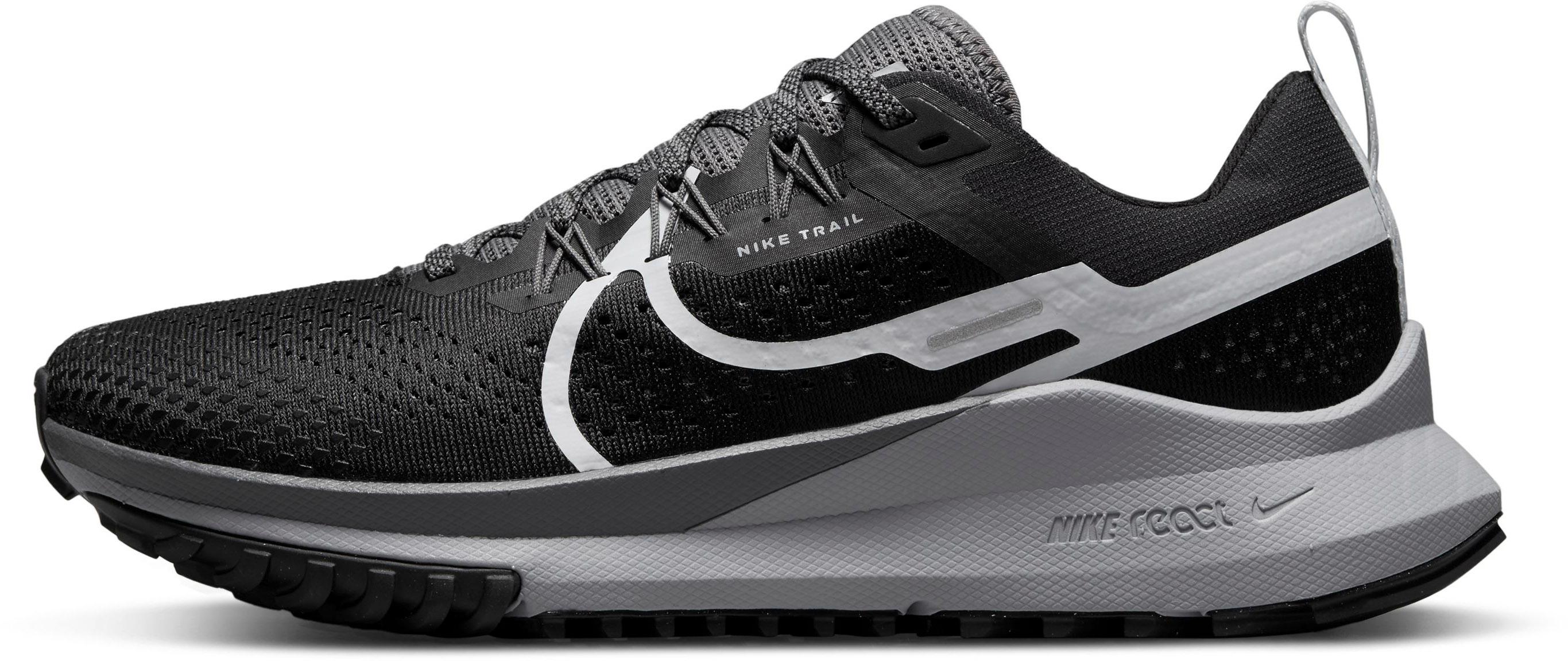 Traillaufschuhe für Damen mit Nike React-Schaumstoff in der Zwischensohle für eine reaktionsfreudige und stabile Dämpfung sowie geschmeidige Übergänge auf felsigem Terrain; aus technischem Mesh für Atmungsaktivität; strapazierfähige Überzüge im Zehenbereich; die Flywire-Technologie ist in ein Mittelfußband integriert und gewährleistet optimalen Halt; Schaft mit Zuglasche; Textilfutter; Gummi-Außensohle mit generativem Traktionsmuster für Grip auf felsigen Trails und geschmeidiges Laufen auf der Straße; Sprengung: 9 mm; für Normalpronierer geeignet; Swoosh-Logo.
