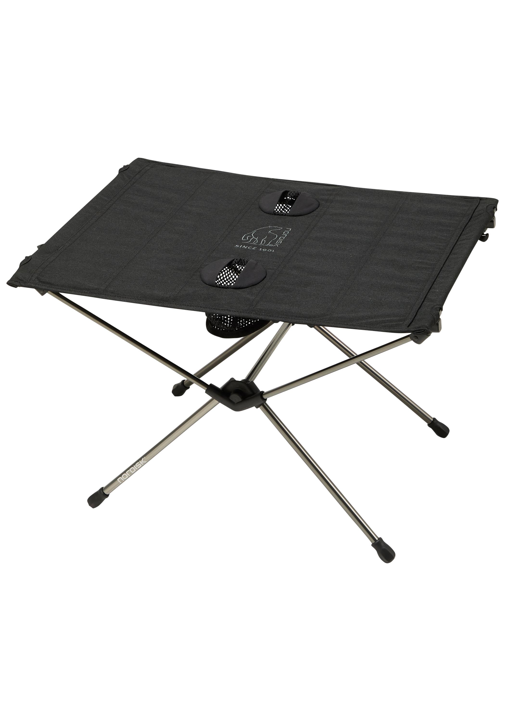 Der kompakte und leichte Tisch rundet den Loungebereich perfekt ab. Er verfügt über eine robuste Tischplatte mit Stoffbezug und ist zudem faltbar. Der Tisch zeichnet sich durch seine Robustheit und Langlebigkeit aus, gefertigt aus einem zusammenfaltbaren Aluminiumrahmen und einem innovativen neuen Stoff von Nordisk. Dieser Stoff kombiniert die Ästhetik von Segeltuch mit der Leichtigkeit von Leinen und verleiht dem Tisch dabei eine stilvolle Note.