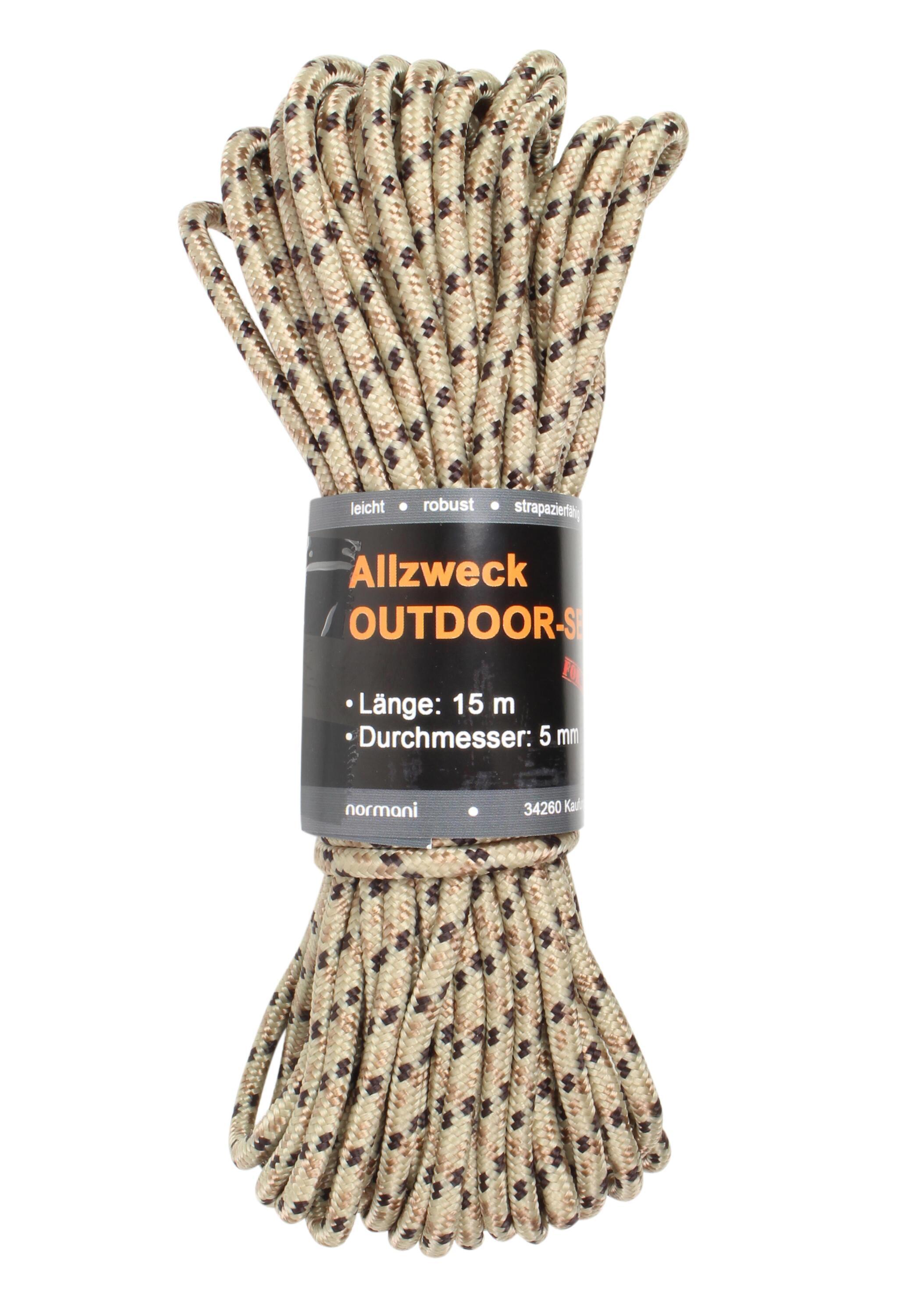 Dieses tragkräftige Allzweck-Outdoor-Seil gehört zur Grundausrüstung auf jeder Tour. Im zusammengeknoteten Zustand lässt es sich einfach in der Seitentasche oder außerhalb des Rucksacks befestigen. Das Multifunktionsseil eignet sich optimal für den Outdoor-Bereich, ob beim Jagen, auf einer Kanutour, beim Fischen, als Wäscheleine beim Campen oder für das Abspannen von Planen. Trotz des geringen Eigengewichts hat das Seil eine hohe Bruchlast, sodass das Abseilen mittelschwerer Lasten ebenfalls zu den unzähligen Einsatzmöglichkeiten dieser Reepschnur gehört. Das geflochtene Universal-Seil aus Polypropylen ist wasserabweisend, abriebfest, hitzebeständig und reißfest. Dabei besitzt diese Reepschnur mit einem Durchmesser von 5 mm eine hohe Bruchfestigkeit von 250 kg. Von dem 15 Meter langen Seil können Sie sich stets genau die Seillänge abschneiden, die Sie gerade benötigen. Achtung: Dieses Seil eignet sich nicht zum Klettern oder Abseilen von Menschen und besitzt keine Zulassung für den Bergsport.