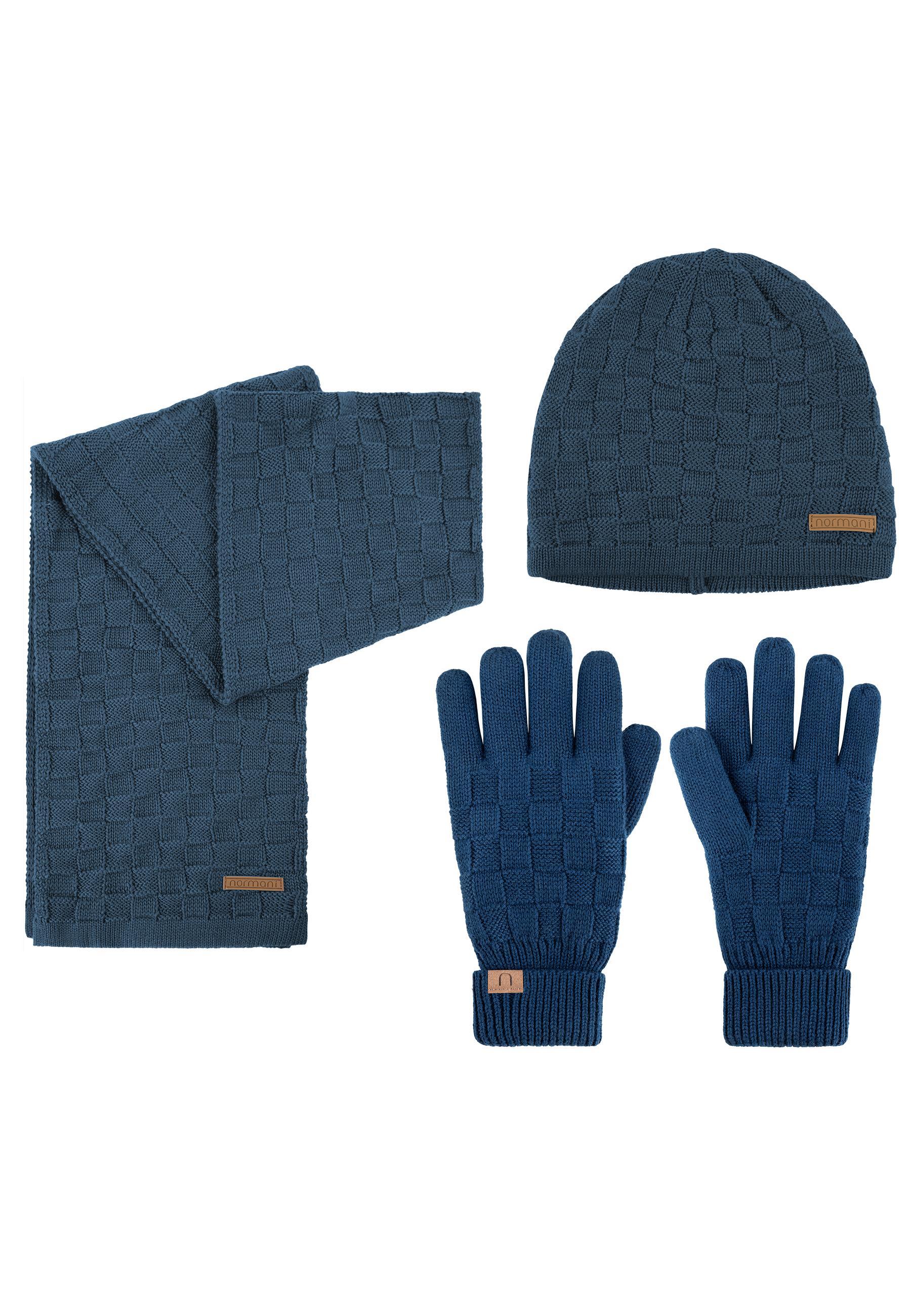Warm und weich zugleich - Das Winterset "Yuma" mit Merinowolle. Dieses elegante Winter-Set, bestehend aus Mütze, Schal und Handschuhen, vereint Komfort, Stil und Funktionalität in perfekter Harmonie. Gefertigt aus einer hochwertigen Materialmischung mit 40% Merinowolle, 40% Polyester, 10% Nylon und 10% Acryl, bietet das Set eine ideale Kombination aus natürlicher Wärme, Strapazierfähigkeit und angenehmem Tragekomfort. Das dezente schachbrettartige Strickmuster verleiht jedem Teil des Sets eine zeitlose und stilvolle Optik, die sich perfekt für den Alltag oder besondere Wintermomente eignet. Ob als Begleiter bei einem ausgiebigen Spaziergang im Schnee, auf dem Weg ins Büro oder an einem kalten Wochenende – dieses Set bietet optimalen Schutz und ergänzt jeden Look auf elegante Weise.