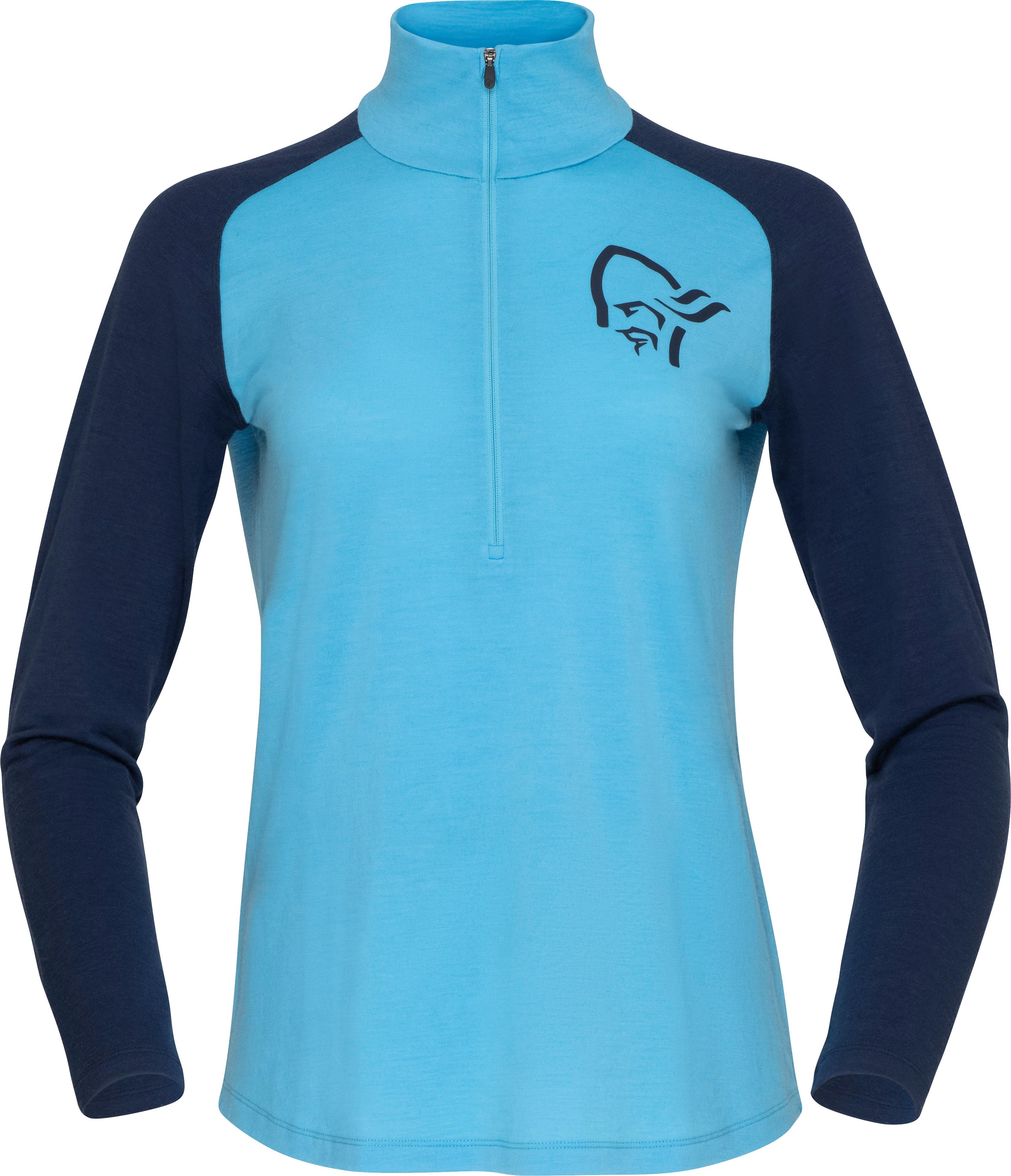 Enganliegendes Langarmshirt für Damen, aus reiner Merinowolle mit hervorragenden thermischen Eigenschaften; atmungsaktiv, geruchsabweisend und feuchtigkeitsregulierend; besonders strapazierfähige Qualität; hoher Stehkragen mit Half-Zip; Logoprint auf Brusthöhe; RWS-zertifizierte Wolle; OEKO-TEX®-Standard 100; Made in Europe; mit Norrøna-Reparaturservice; Material 100% Wolle (Merinowolle).