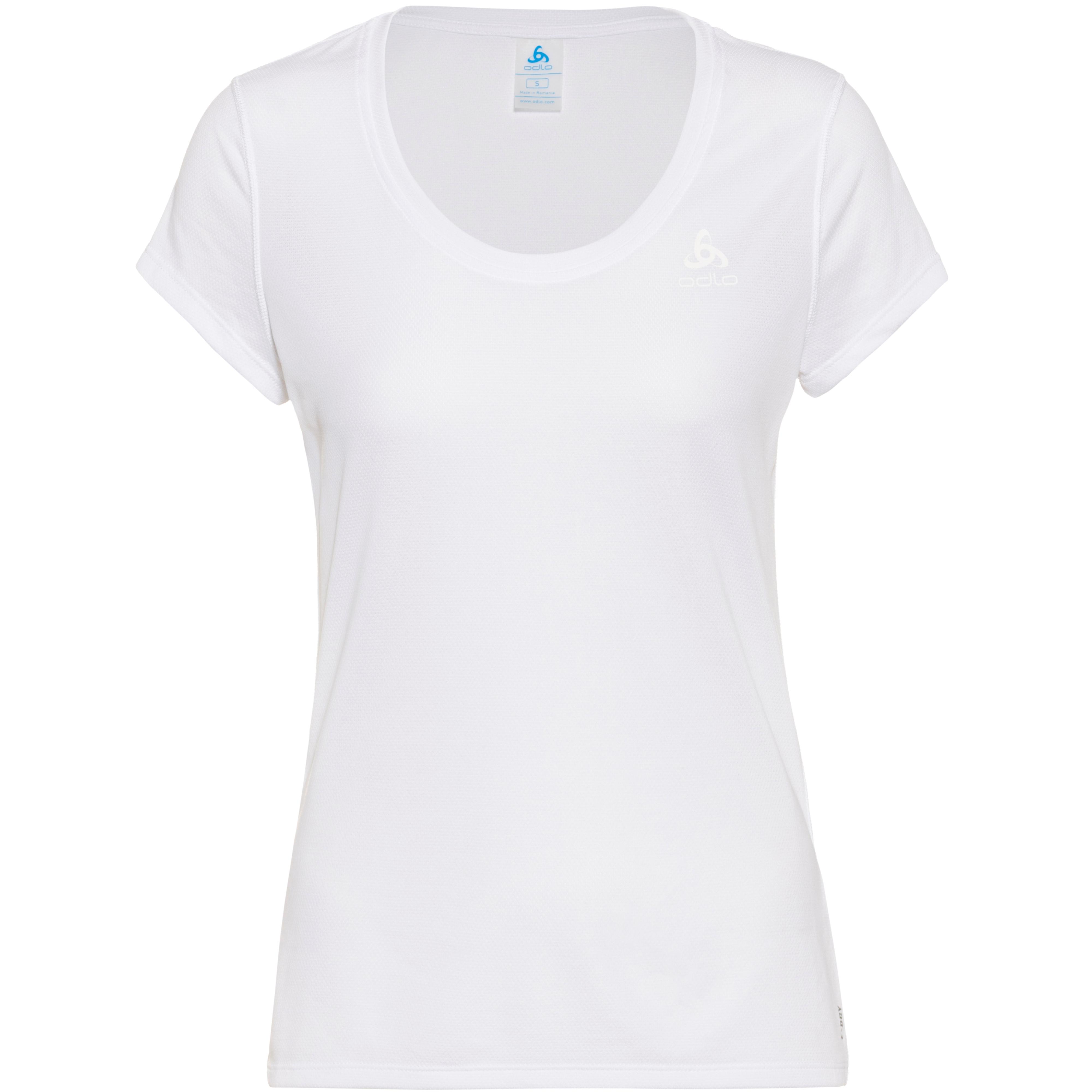 Funktionsshirt aus leichtem, weichem Mesh-Material; Rundhalsausschnitt mit Nackenband; kurze Ärmel; reibungsarme Flachnähte; F-Dry-Technologie; feuchtigkeitsableitend; schnelltrocknend; odlo TCS°-System; schmale Passform; Material 88% Polyester, 12% Polypropylen.