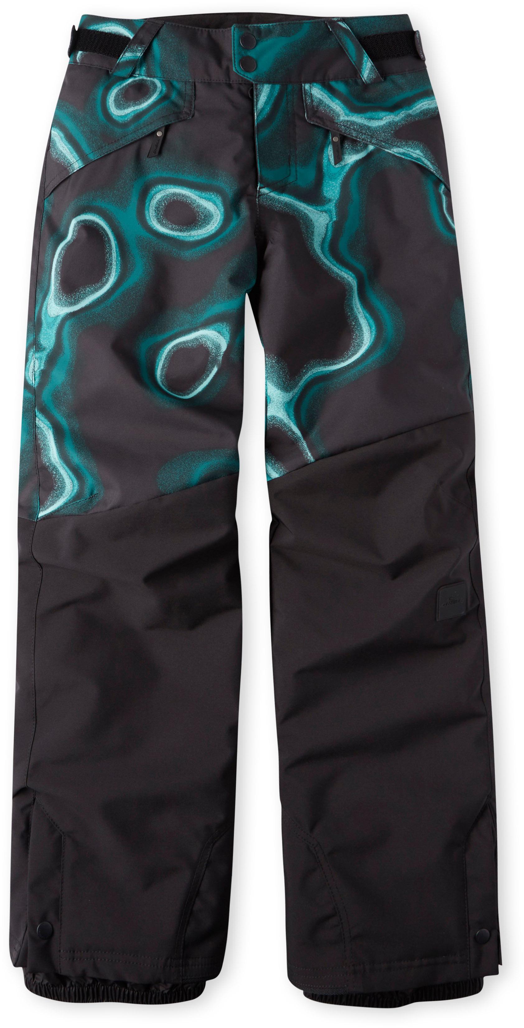 Wasserdichte und atmungsaktive Snowboardhose mit versiegelten Nähten an kritischen Stellen; grafischer Print; Bund mit Gürtelschlaufen, 2 Druckknöpfen und Klettriegeln zur Weitenverstellung; 2 Reißverschlusstaschen; vorgeformte Knie; Beinabschlüsse mit seitlicher Druckknopfleiste und integrierten Gamaschen; Material 100% Polyester (davon 50% recycelt).