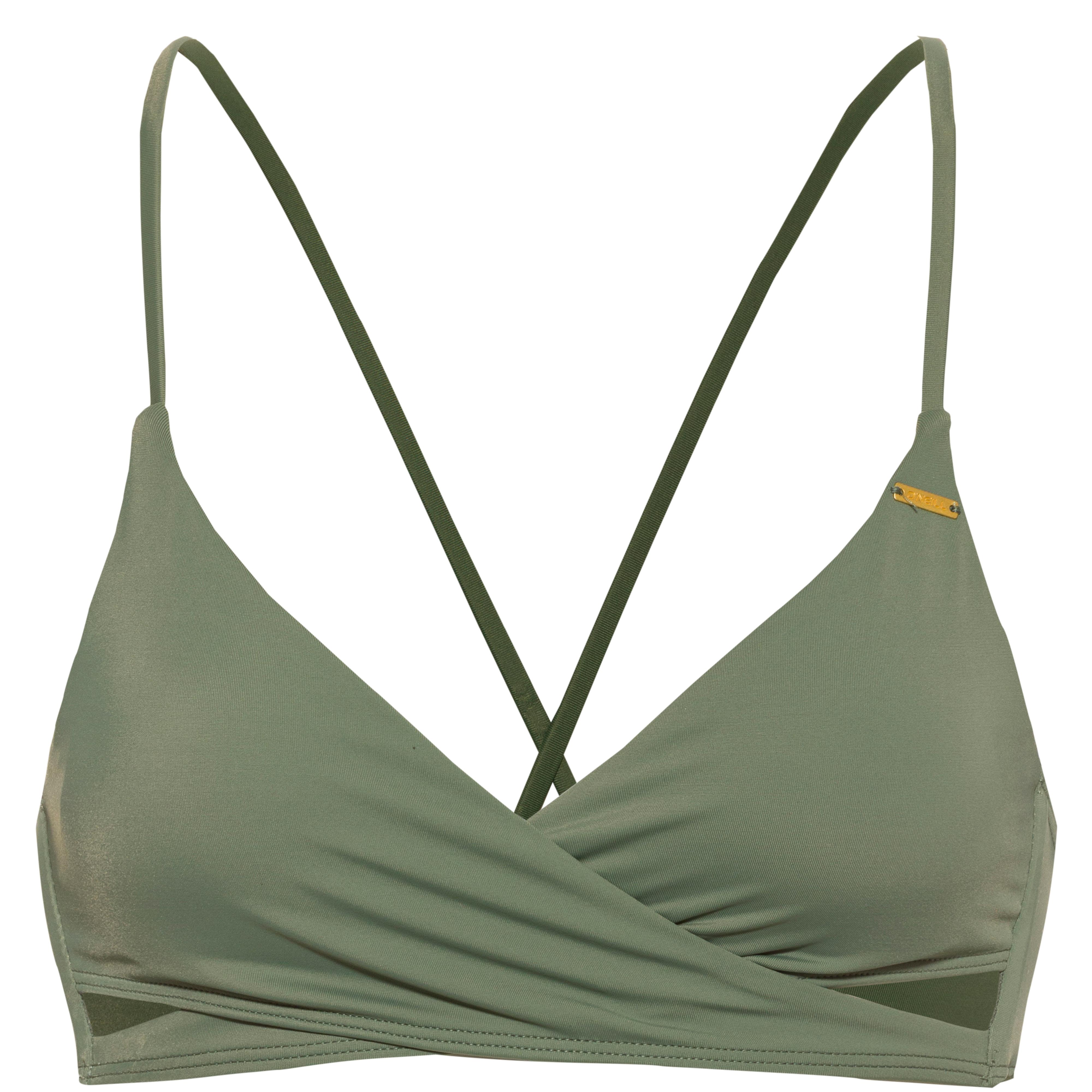 Bikini-Oberteil in Wickel-Optik; sich am Rücken überkreuzende Spaghettiträger; Rückenverschluss mit Bändeln und Schnalle; gefüttert; mit recycelten Materialien hergestellt; Material 78% Polyamid, 22% Elastan, Material 92% Polyester, 8% Elastan.