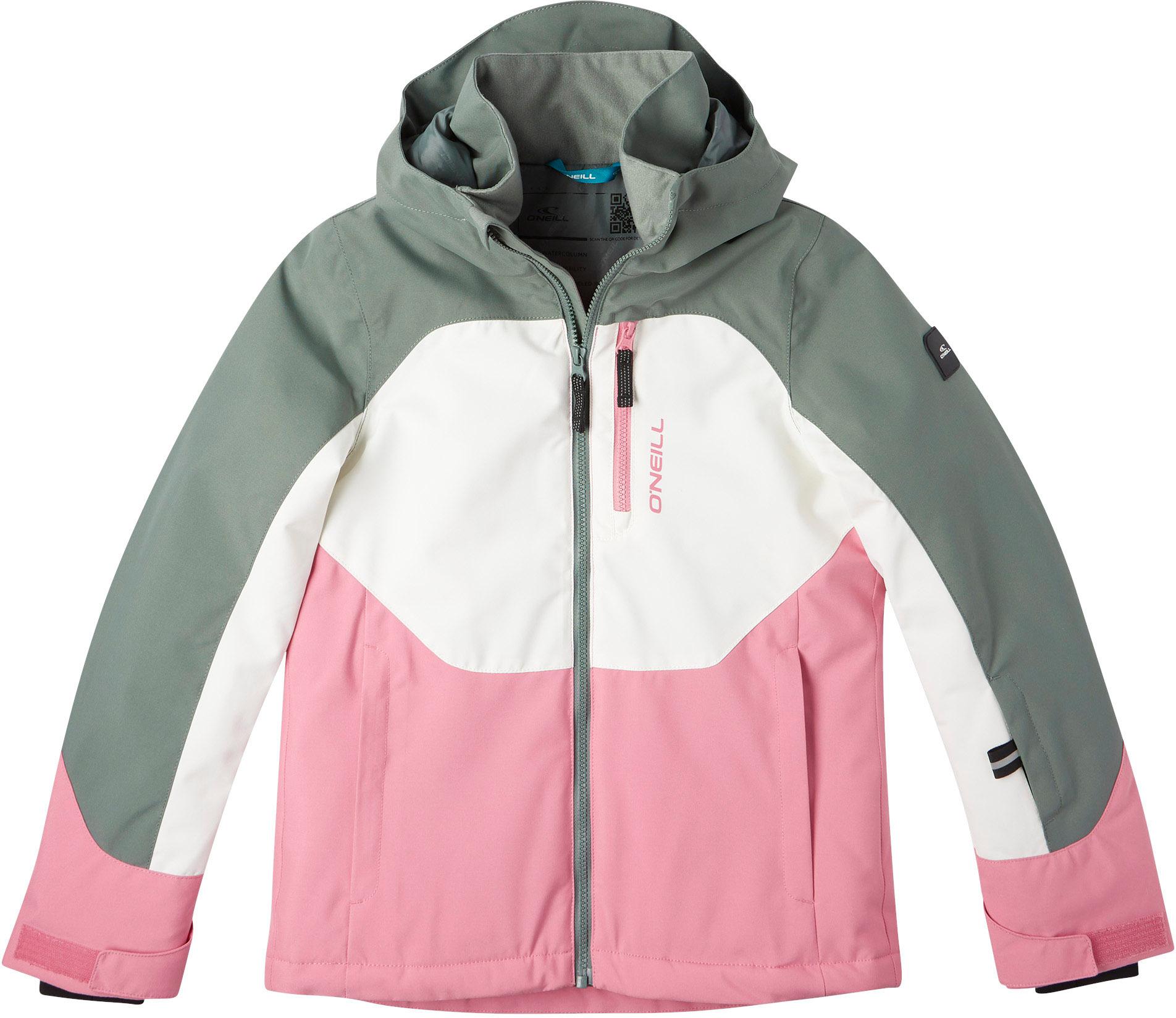 Snowboardjacke im Colorblock-Design; feste Kapuze; hoher Kragen; Frontreißverschluss mit Kinnschutz; 2 Eingrifftaschen und 1 Brusttasche mit Reißverschluss; Ärmelabschlüsse mit verstellbaren Klettriegeln; Material 100% Polyester (davon 45% recycelt).