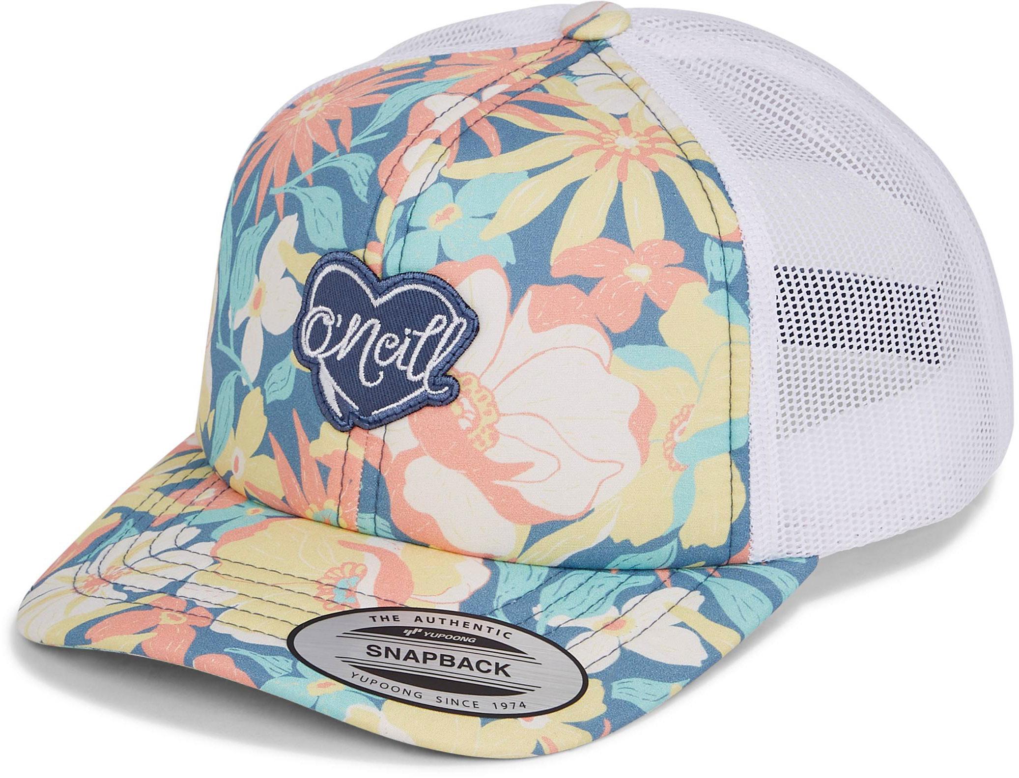 Trucker-Cap mit 6-Panel-Design und leicht gebogenem Schirm; Vorderseite mit floralem Print; Rückseite aus recyceltem Mesh mit Snapback-Verschluss; weiches Innenband; Material 100% Baumwolle (Bio-Baumwolle).