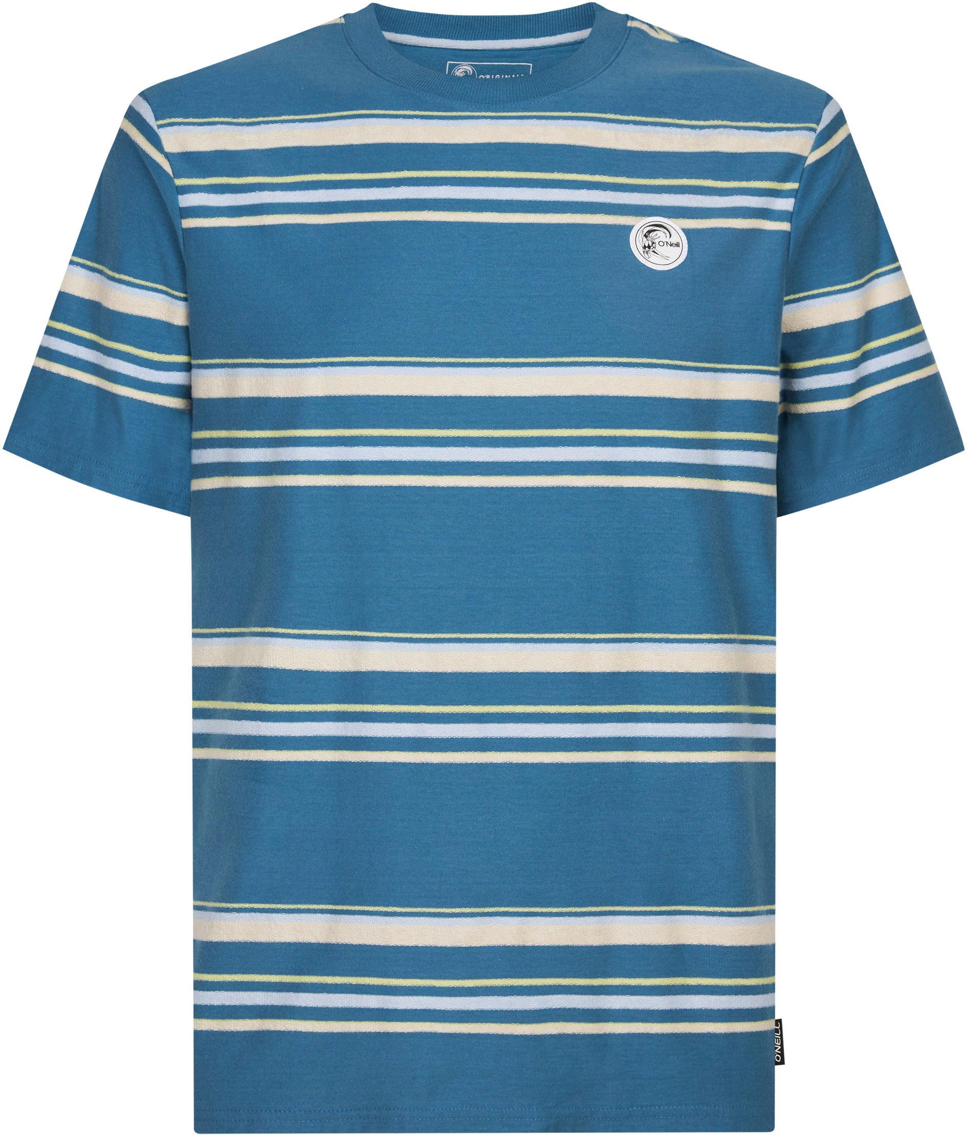T-Shirt mit Retro-Streifenmuster; gerippter Rundhalsausschnitt; Logodetail auf der Brust; reguläre Passform; Material 100% Baumwolle.