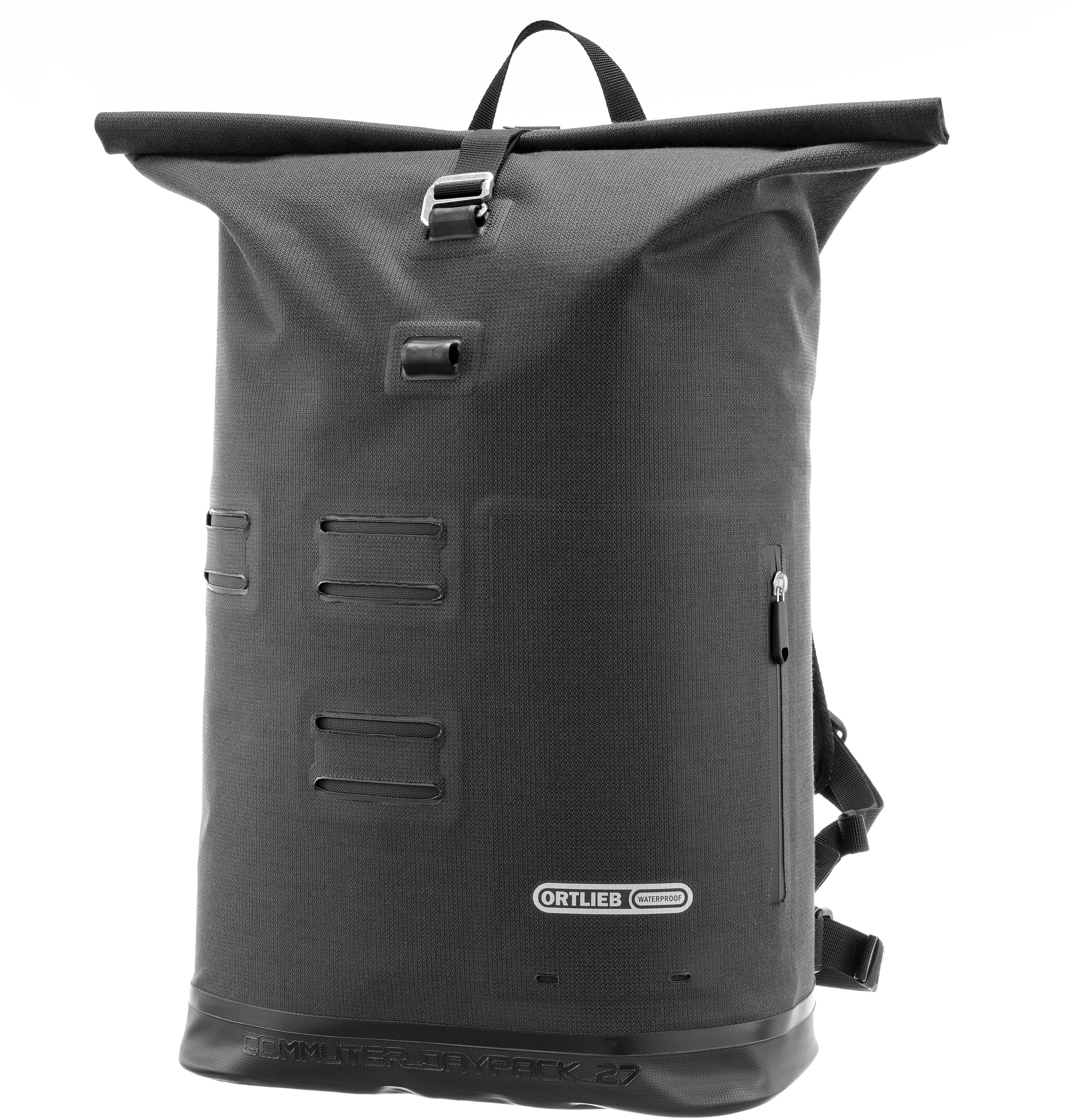 Wasserdichter Rucksack für Alltag und Stadt; aus strapazierfähigem, PU-beschichtetem Cordura®-Mischgewebe; Hauptfach mit Rollverschluss und Haken; gepolstertes Laptopfach; Fronttasche mit Reißverschluss (nicht wasserdicht); Schlaufe zur Befestigung von Rücklicht und Bügelschloss; verstärkter Boden; TPU-Rückenpolster mit Lüftungskanälen; ergonomische Schulterträger; abnehmbarer Brust- und Hüftgurt; Tragegriff an der Oberseite; reflektierende Details; Volumen: 27 l; Maße (H/B/T): ca. 50 x 32 x 21 cm; Gewicht: ca. 790 g; Zuladung: 8 kg; Made in Germany.