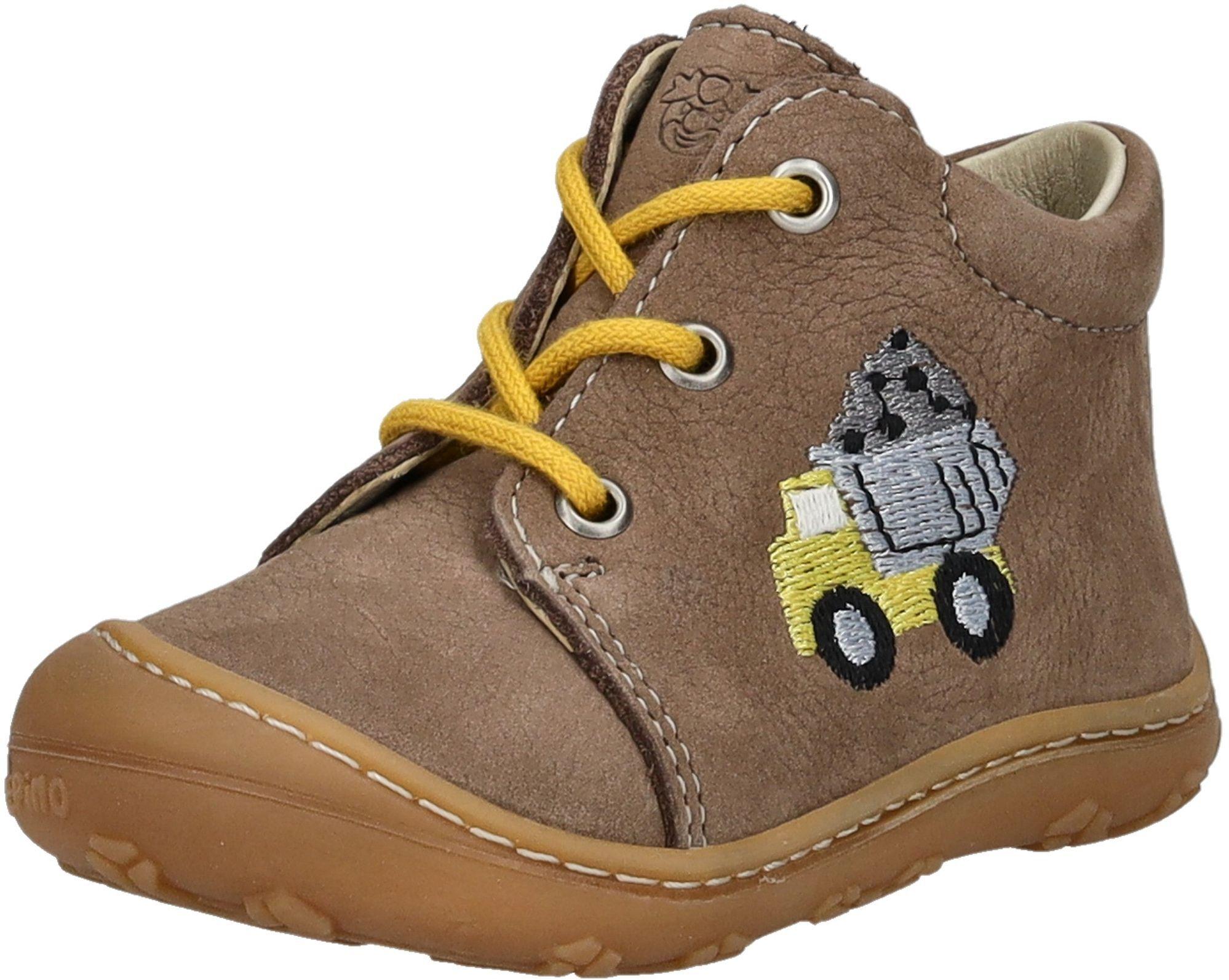 Genau das Richtige für kleine, heranwachsende Kinderfüßchen ist dieser verspielte Lauflernschuh von Pepino mit einem fröhlichen Wetter-Motiv. Das Obermaterial sowie das Innenfutter bestehen aus hochwertigem, atmungsaktivem und flexiblem Leder, das sich optimal anpasst und Feuchtigkeit absorbiert. Die flexible Sohle aus rutschhemmendem Naturkautschuk geht mit jedem Schritt mit und bietet selbst bei unsicherem Gehen einen optimalen Komfort.