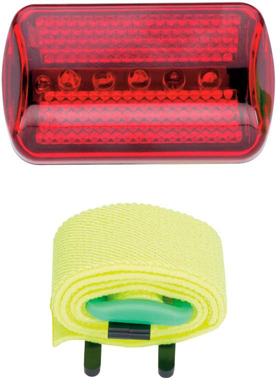 Vielseitig einsetzbares LED-Sicherheitslicht; Funktionen: Dauerlicht, Blinklicht, Aus; 5 LEDs; Cliphalterung mit Gummiband; inklusive 2 x AAA Batterien.