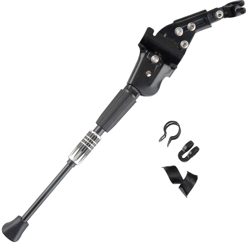 Fahrrad-Hinterbauständer mit 3 gummierten Schellen für 14-24 mm Rohrdurchmesser; Hinterbau- und Sitzrohrstrebe-Montage; aus Aluminium; verstellbar von 26'' bis 29''.