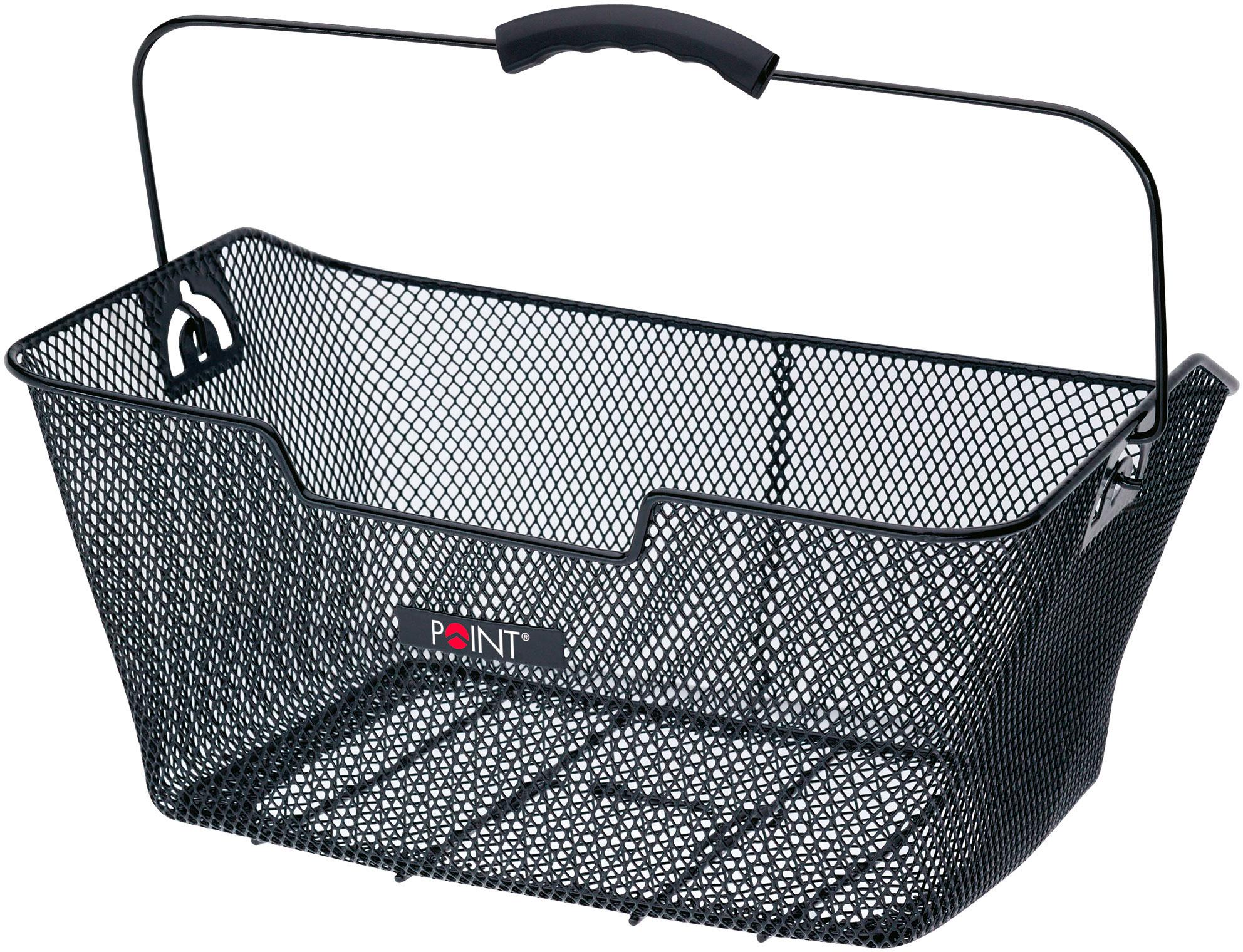 Engmaschiger Hinterrad-Korb aus Metall; Tragebügel mit Ergogriff; abgeschrägte Seiten; Federklappen-Ausschnitt; Maße (B/H/T): ca. 40 x 28 x 18 cm.