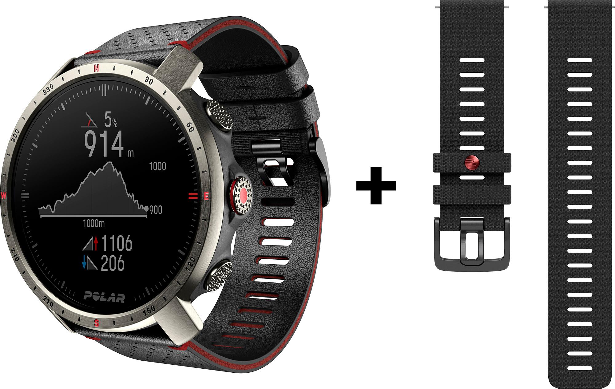Wasserdichte Premium Outdoor-Multisportuhr mit integriertem GPS, GLONASS, Galileo und QZSS mit Assisted GPS für die schnelle Positionsbestimmung, optischer Pulsmessung am Handgelenk, Kompass und Höhenmesser sowie den einzigartigen Trainingsfunktionen von Polar; Militärstandard; Always-On-Farbtouch-Display - für Outdoor-Nutzung optimiert (1,2 Zoll, 240 x 240 px); Saphirglas mit Anti-Fingerprint-Beschichtung; Linsenschutz durch hochwertige Aerospace Titanlünette; Track Back; Routen- und Höhenprofile; Always-On Tageslichtübersicht; Always-On Navigationsansichten; Turn-by-Turn Navigation powered by Komoot; Wetterinformnationen; Musiksteuerung; FuelWise™ - smarter Energieassistent; umfassende Leistungstests; Nightly Recharge™ Erholungsanalyse; Hill Splitter™ - detaillierte Leistungsdaten zu Auf- und Abstiegen; Polar Precision Prime Sensor-Fusionstechnologie; Laufprogramme inkl. Trainingsplan; Schwimm-Metriken; Smart Calories; über 130 Sportarten; ultralange Akkulaufzeit: bis zu 40 Std. Trainingszeit (mit GPS und OHR), bis zu 100 Std. im Energiesparmodus; aufladbarer Lithium-Polymer-Akku; kompatibel mit allen gängigen BLE Herzfrequenz-Sensoren, Schrittfrequenz-Sensoren und Laufleistungsmessern sowie Geschwindigkeits-, Trittfrequenz- und Leistungs-Radsensoren; Maße: ca. 47 x 47 x 13 mm; hochwertiges FKM-Armband; S/M: Handgelenksumfang ca. 130-190 mm; M/L: Handgelenksumfang ca. 145-215 mm; Gewicht: ca. 73 g mit FKM-Armband, 41 g ohne Armband; inkl. USB-Ladekabel.