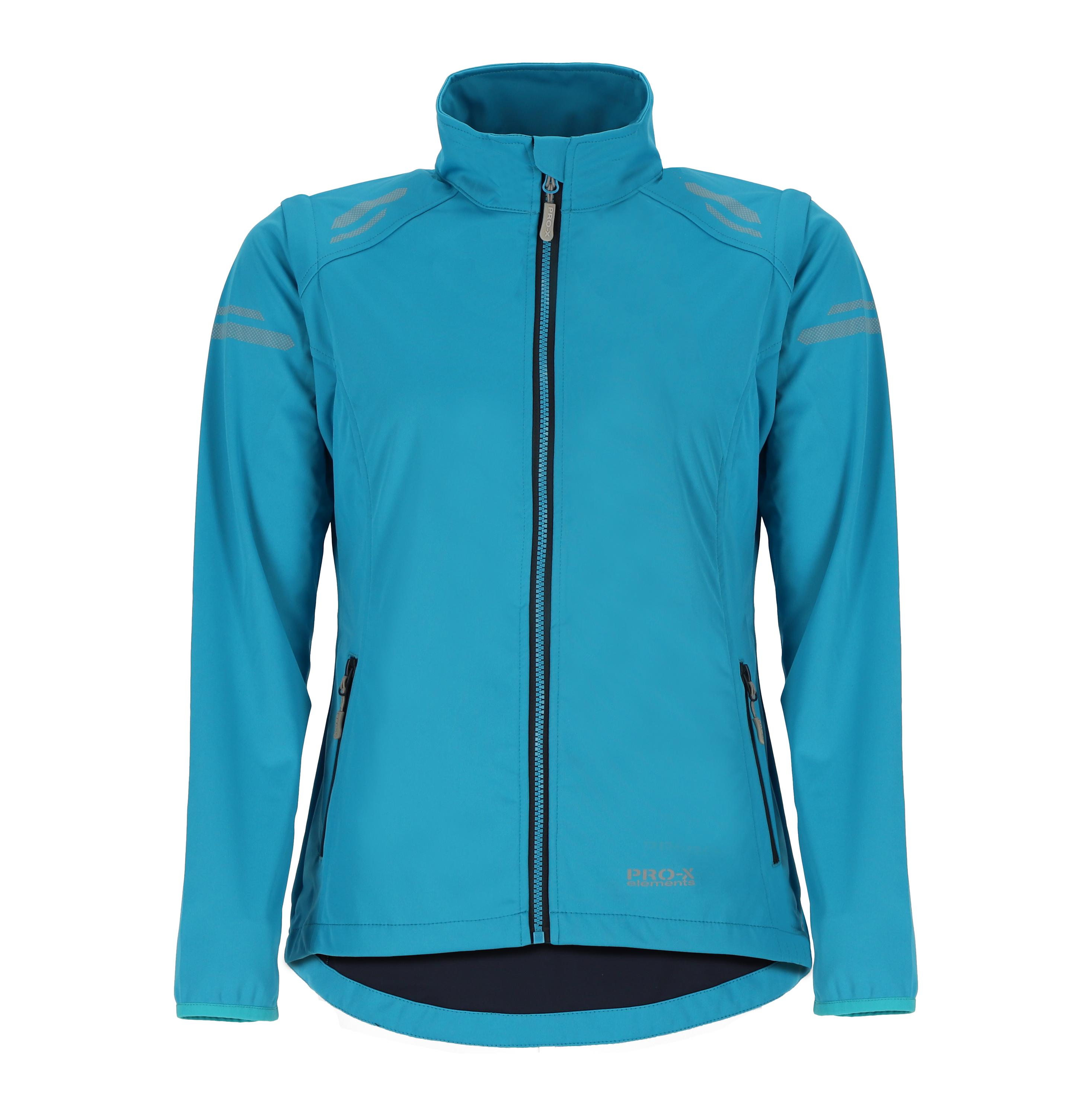 Funktionelle Damen-Softshelljacke mit abnehmbaren Ärmeln und PXE Windschutzmembran. Durchgehender unterlegter Front-RV. 2 RV-Seitentaschen. Besonders geeignet fürs Radfahren durch verlängertes Rückenteil und reflektierende Elemente.