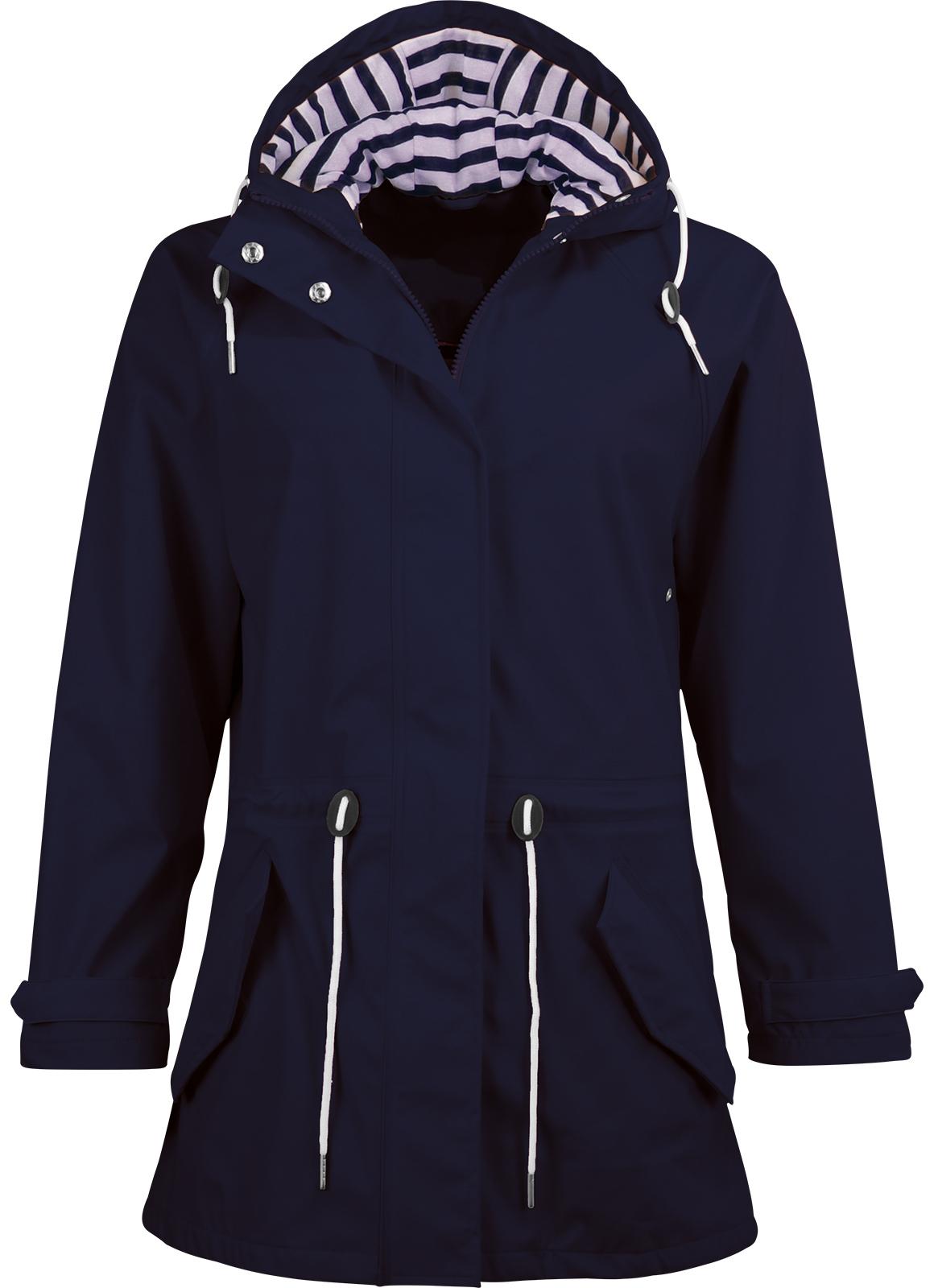 Damen-Friesennerz mit 2-Wege-Front-RV. Kordelzug in der Taille. 2 Seitentaschen. Angeschnittene Kapuze. Maritimer Print innen unter der Kragennaht. Verstellbare Armabschlüsse. Gewicht in Gr. 38 = 1360 g. Rückenlänge in Gr. 38 = 82 cm.