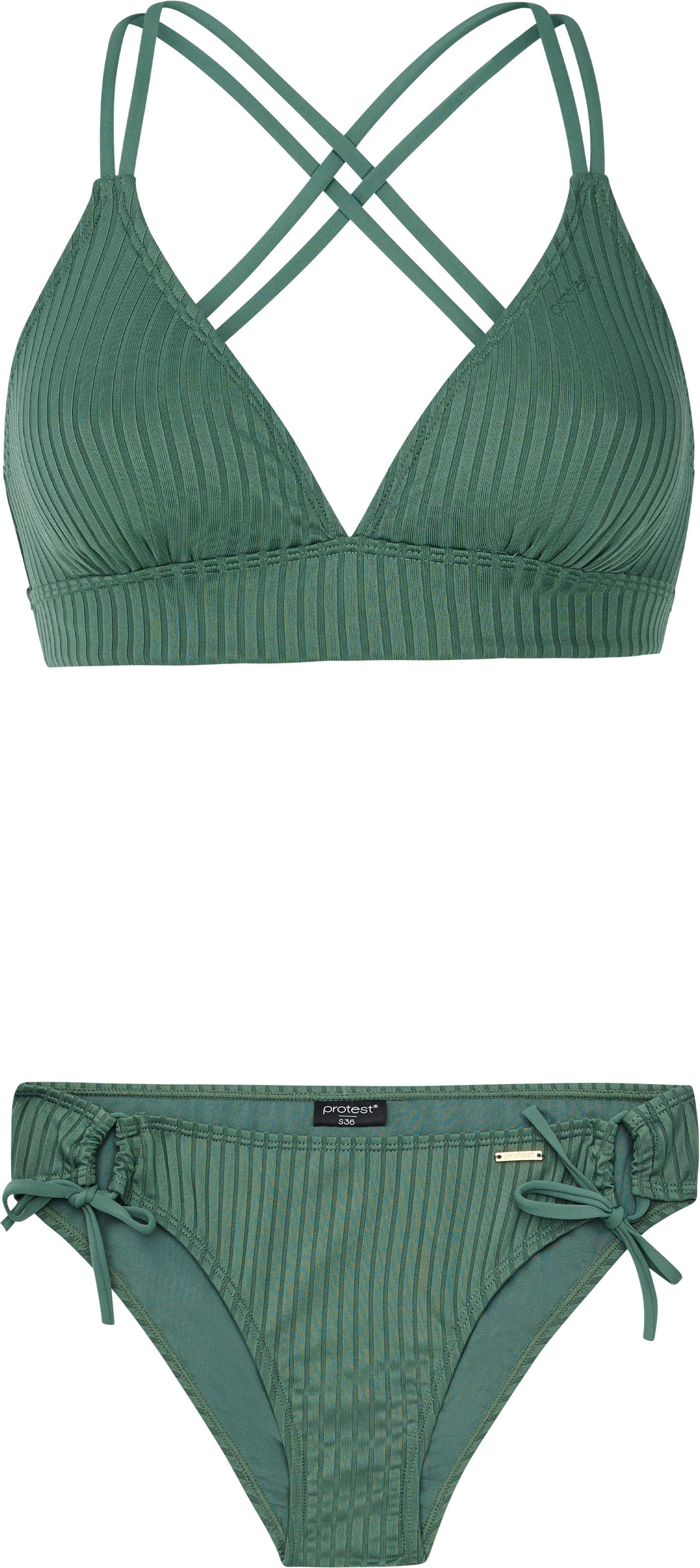 Bikiniset aus elastischem, gefüttertem Material mit gestreifter Struktur; Triangel-Oberteil mit doppelten Trägern, welche sich am Rücken überkreuzen; Unterbrustband mit Clipverschluss am Rücken; Cups mit herausnehmbaren Pads; Slip mit seitlichen Schnürdetails und Labeldetail am Bund; mit Recyclingmaterial hergestellt; Material 93% Polyester, 7% Elastan.