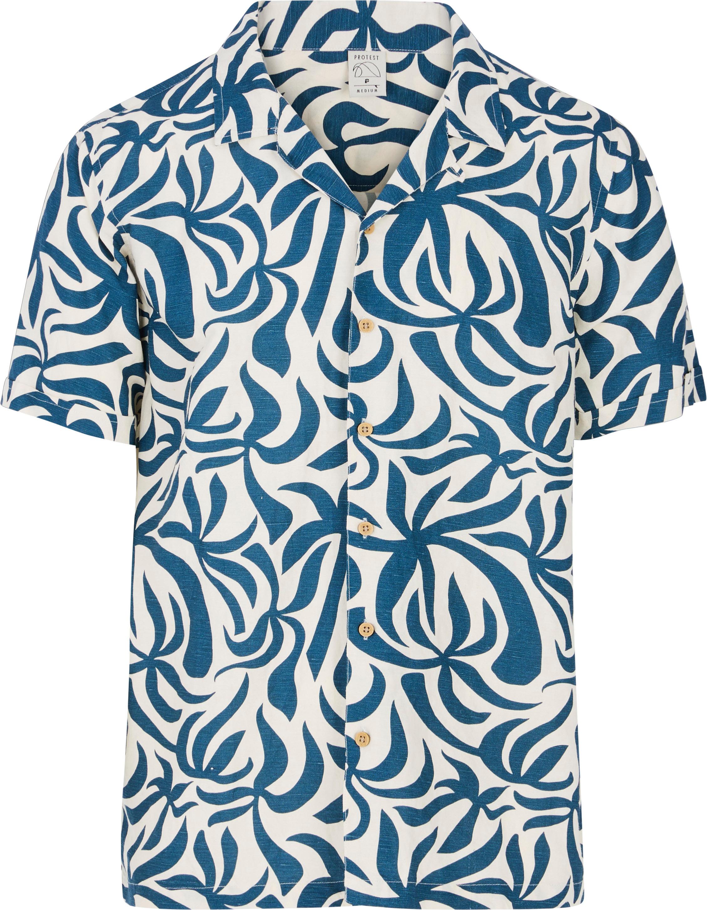 Kurzärmeliges Hemd mit sommerlichem Allover-Print; klassischer Hemdkragen und zentrale Knopfleiste; Material 70% Viskose, 30% Leinen.