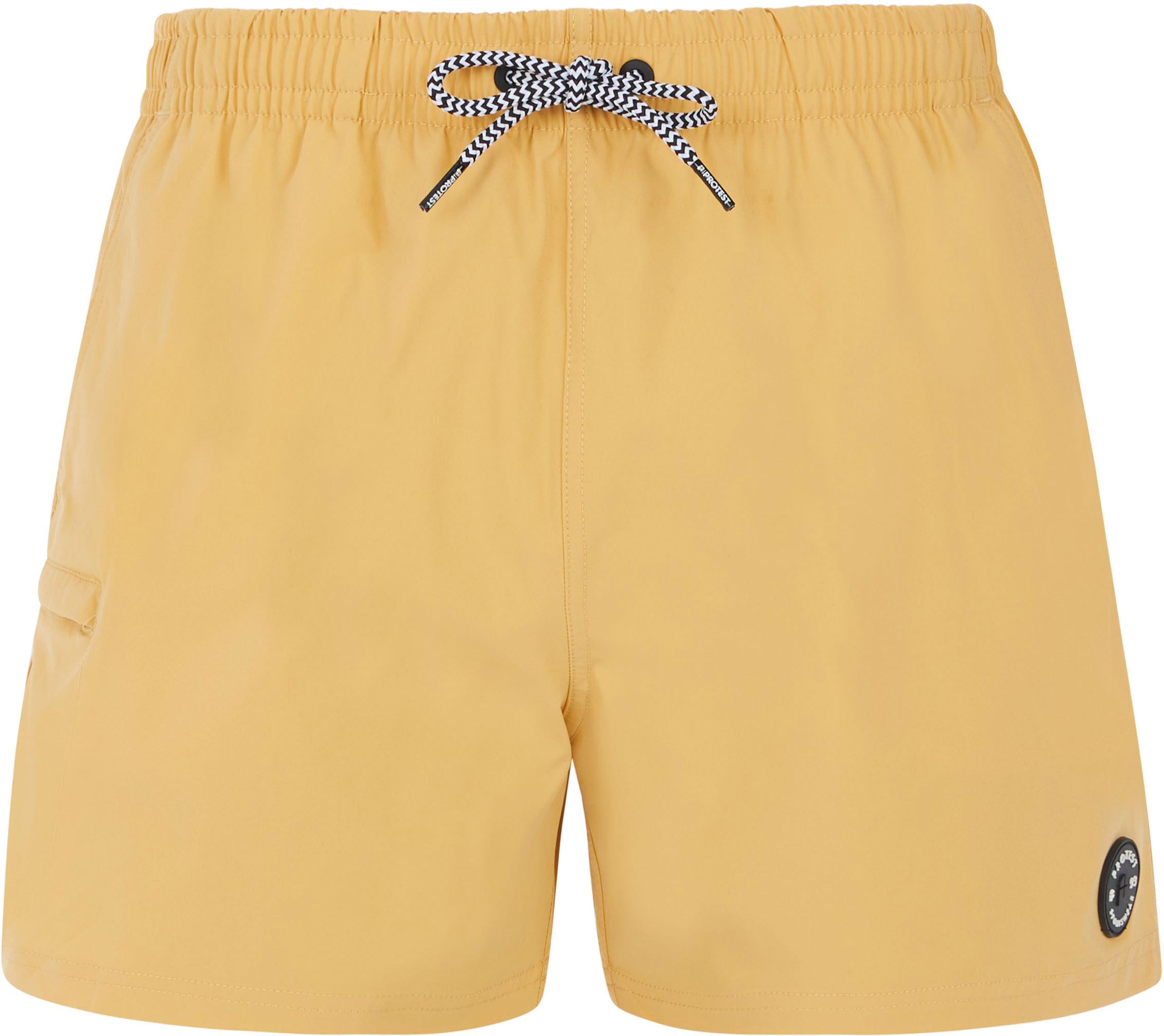 Kurze Badeshorts aus angenehm weichem Material mit Stretch-Effekt; einfarbiges Design; elastischer Bund mit gemustertem Kordelzug; seitliche Eingrifftaschen; 1 Gesäßtasche und 1 Beintasche mit Reißverschluss; Labelpatch aus Gummi; Mesh-Innenslip; normale Passform; Seitenlänge: ca. 35 cm/Gr. M; Material 100% Polyester.