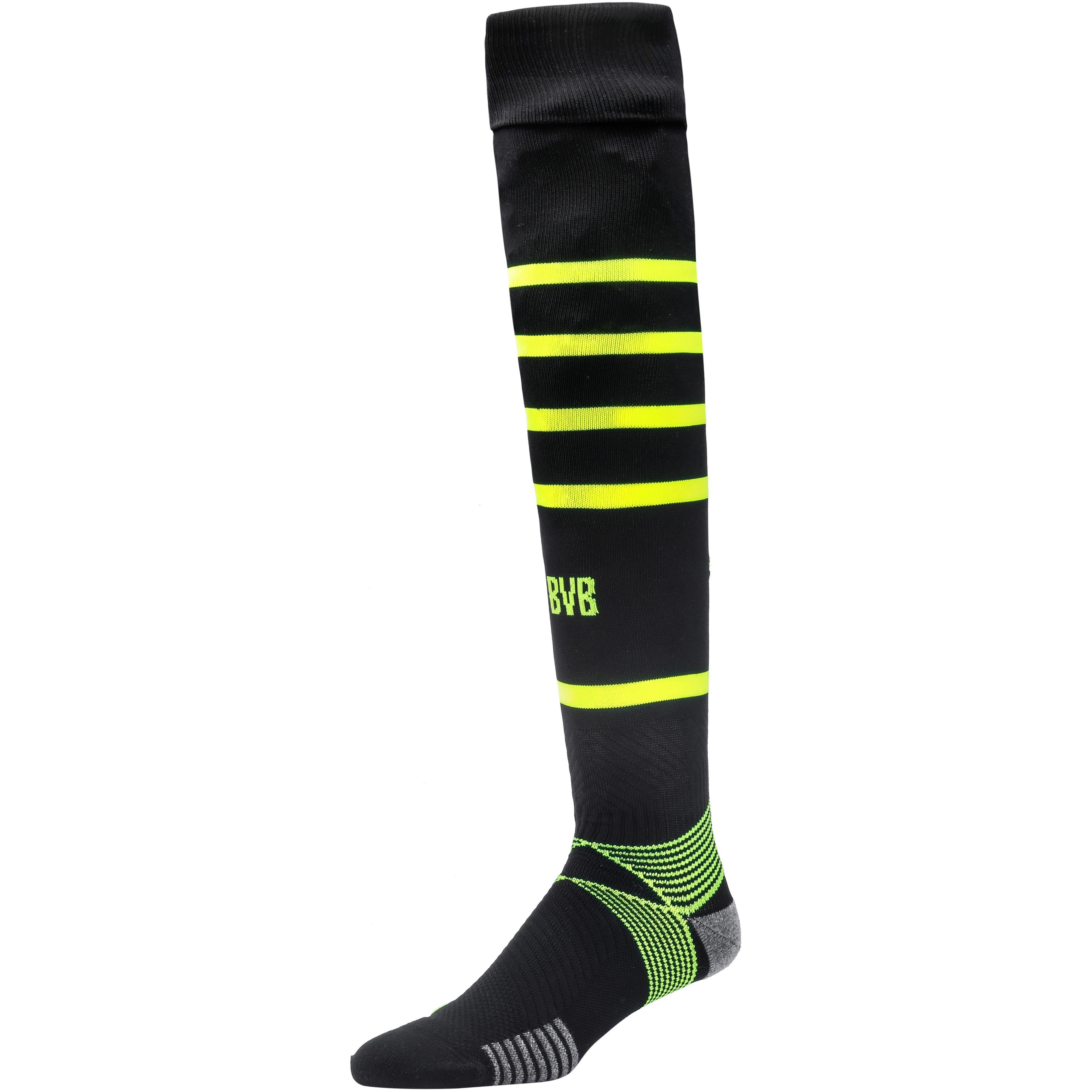 Fußball-Stutzen im Design des BVB Dortmund; anatomische Rechts-Links-Passform; doppellagiger Umschlag für optimalen Komfort; kompakt gestrickter Knöchelbereich mit flexibler Zone und Unterstützung durch überkreuzte Kompression, Mesh-Einsätze zur Belüftung; gepolsterter Zehen- und Fersenbereich; Material 60% Polyester, 30% Polyamid, 8% Baumwolle, 2% Elastan.