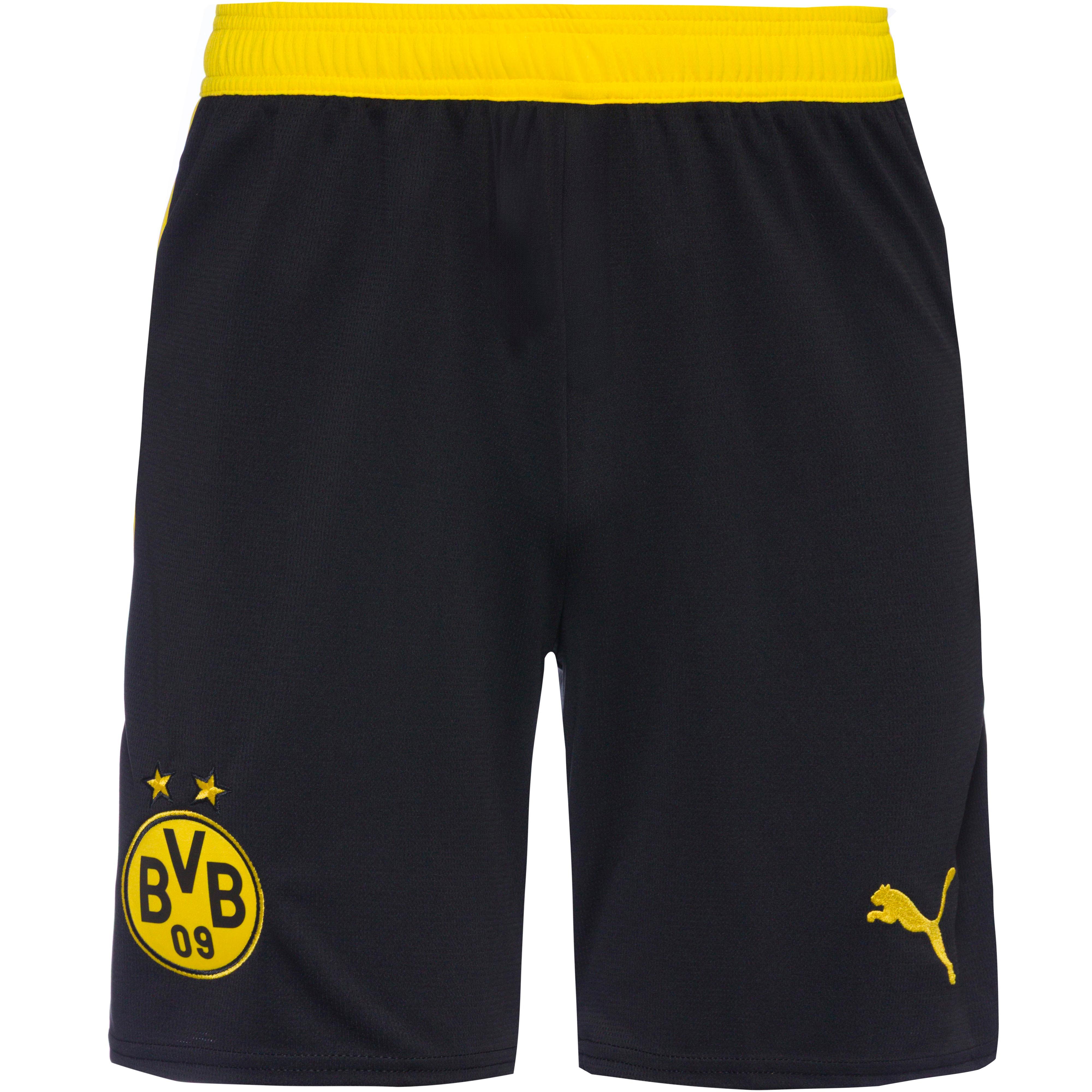 Fußballshorts im Replika-Design der Borussia Dortmund; mit feuchtigkeitsableitender und schnelltrocknender dryCELL-Technologie; elastischer Bund mit innenliegendem Kordelzug; Vereinswappen und PUMA Cat-Logo; normale Passform; Material 100% Polyester.