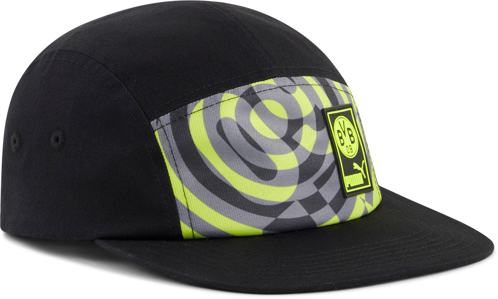 Snapback-Cap mit großem Frontprint im Design von Borussia Dortmund; mit Vereinswappen und Logodetail; klassisches 5-Panel-Design; flacher Schirm; weitenregulierbar durch Druckknopfverschluss; Material 100% Polyester.
