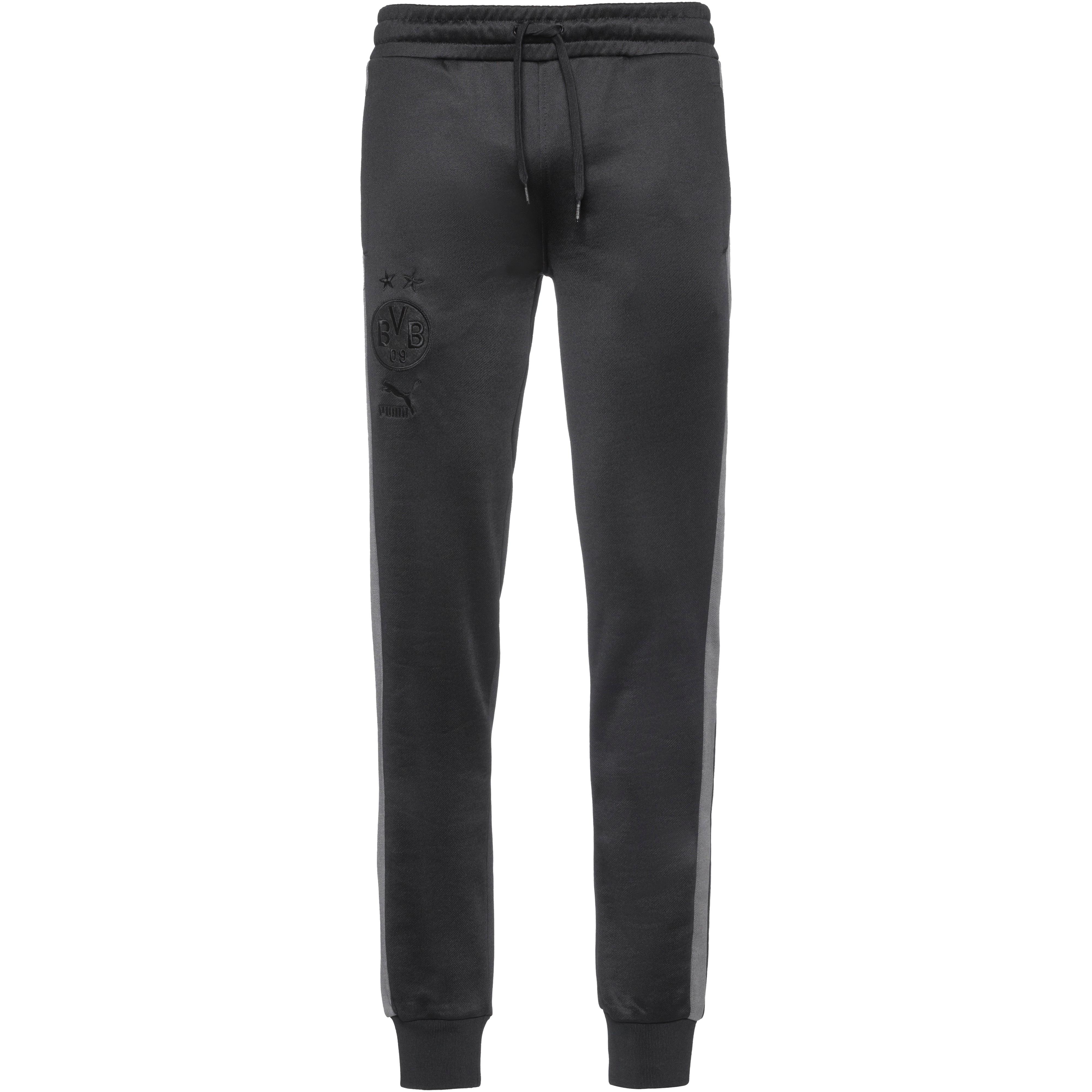 Trainingshose für BVB-Fans; elastischer Bund mit Kordelzug; 2 Seitentaschen und eine Gesäßtasche; Logostickereien am Bein; seitliche Kontraststreifen entlang der Beine; Material I 58% Polyester, 42% Baumwolle; Material II 97% Polyester, 3% Elastan; Material III 100% Baumwolle.