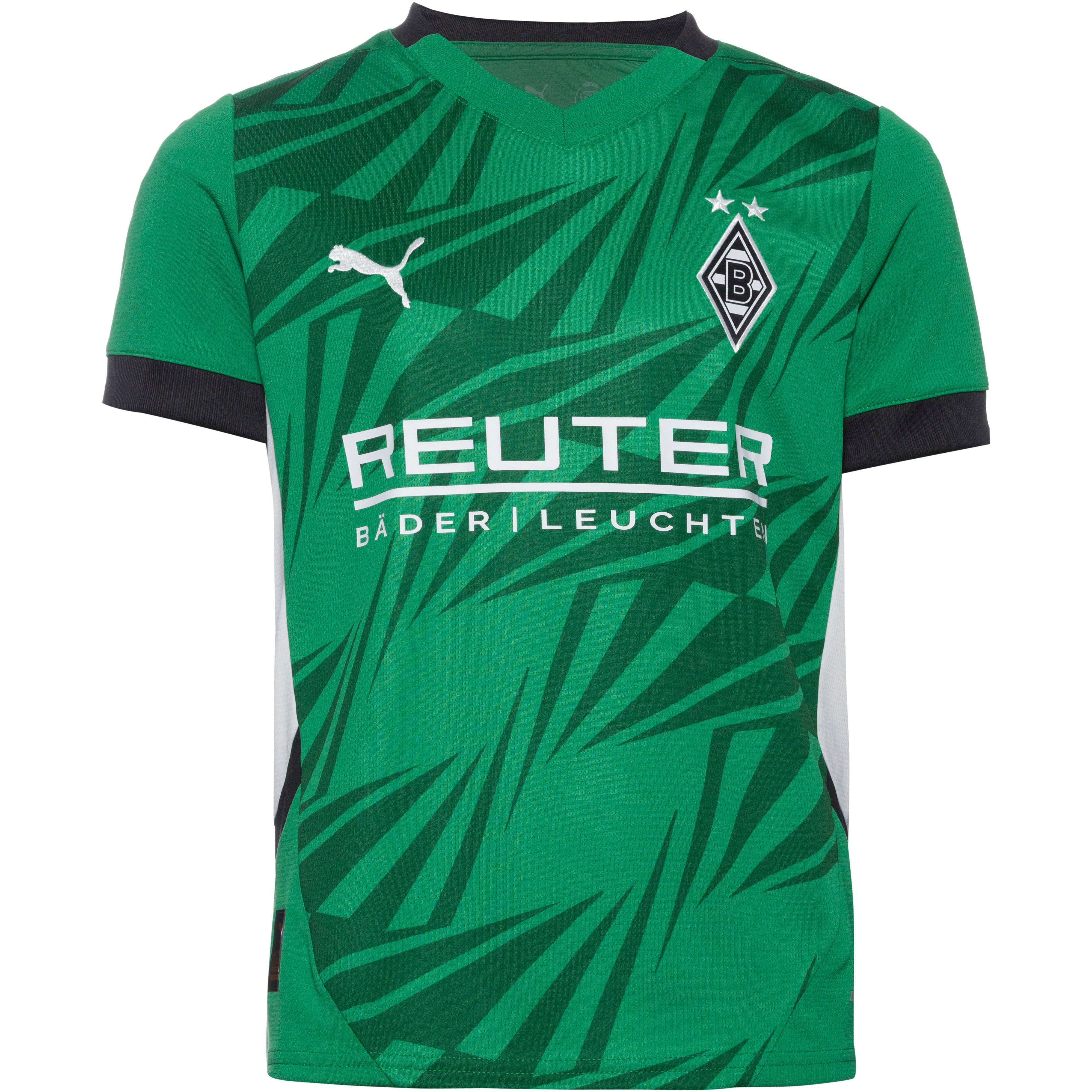 Auswärts-Trikot für Kinder, des Borussia Mönchengladbachs, für die Saison 2024/2025; mit feuchtigkeitsableitender und schnelltrocknender dryCELL-Technologie; V-Ausschnitt; Marken-, Sponsoren- und Vereinsdetails auf der Front; im Re:fibre Prozess aus mind. 95% recyceltem Textilabfall hergestellt; Material 100% Polyester.