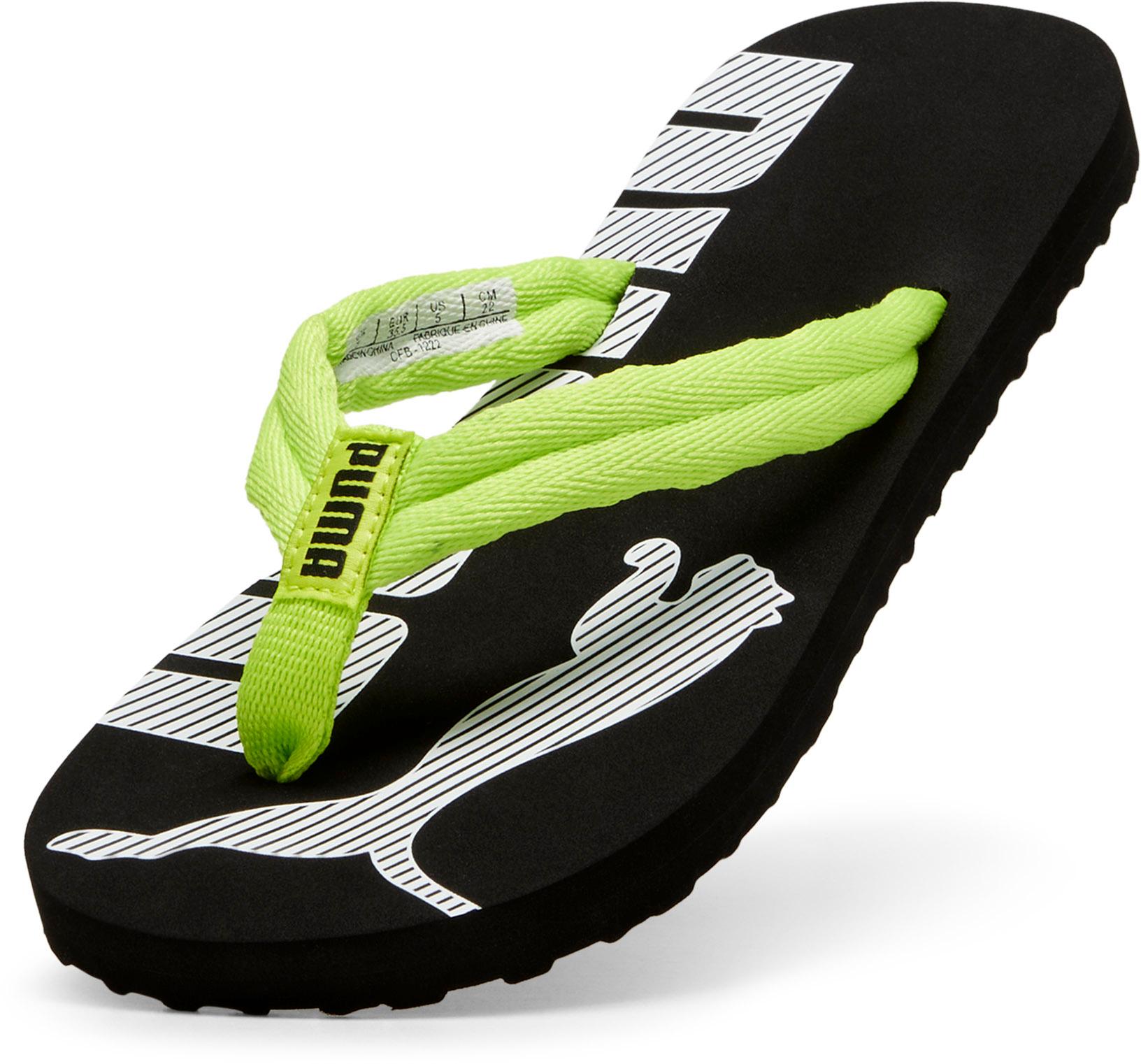 Zehentrenner mit weich gewebtem Textil-Zehensteg; gepolstertes Fußbett mit markantem Labelprint; flexible Synthetik-Laufsohle mit Grip.