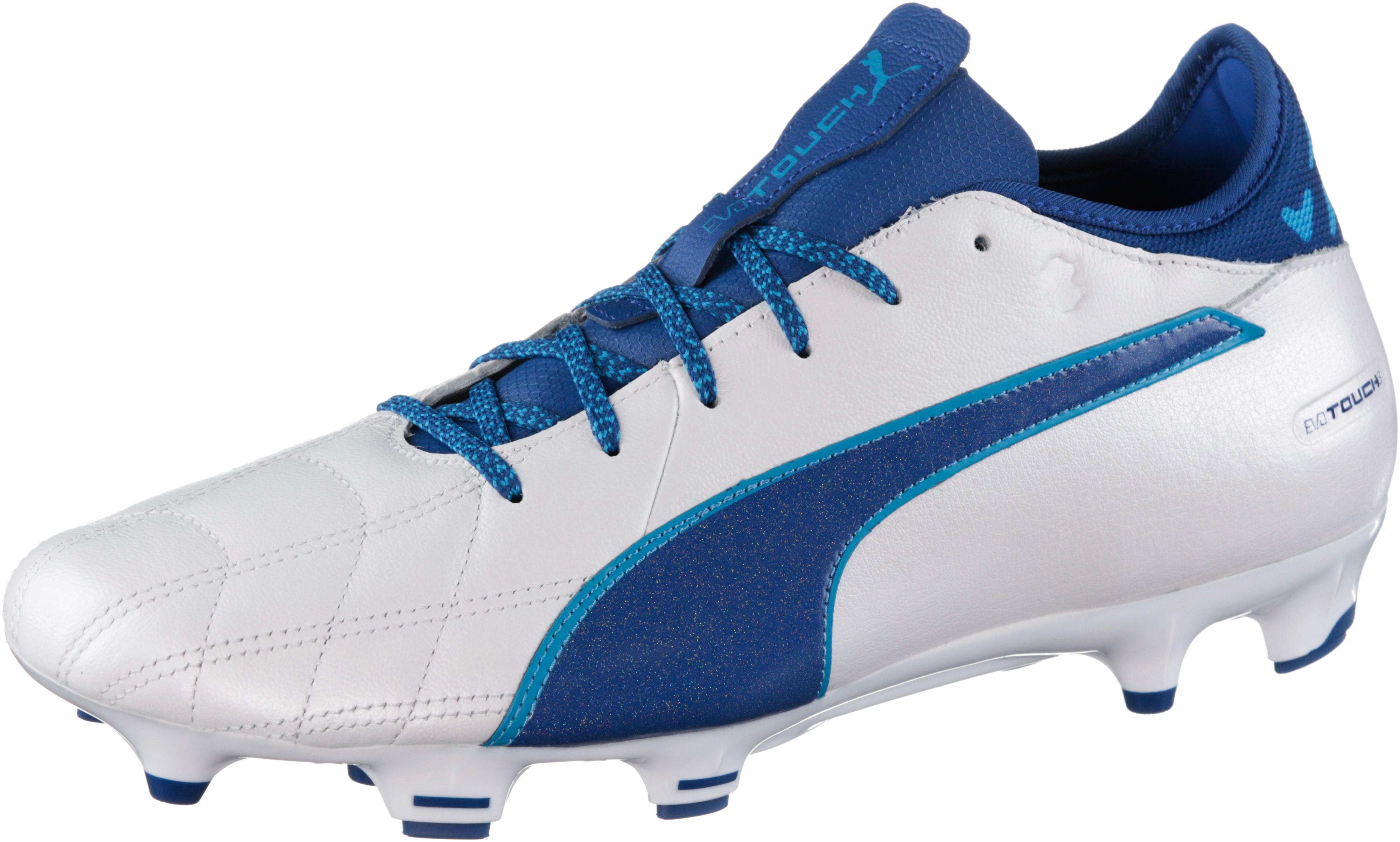 PUMA EVOTOUCH 3 LTH FG. Fußballschuhe mit weichem Obermaterial aus Leder; Fersen-Kappe; Obermaterial aus Leder und Textil; Innensohle aus Textil; TPU-Laufsohle mit länglichen und konischen Stollen; enthält nichttextile Teile tierischen Ursprungs.