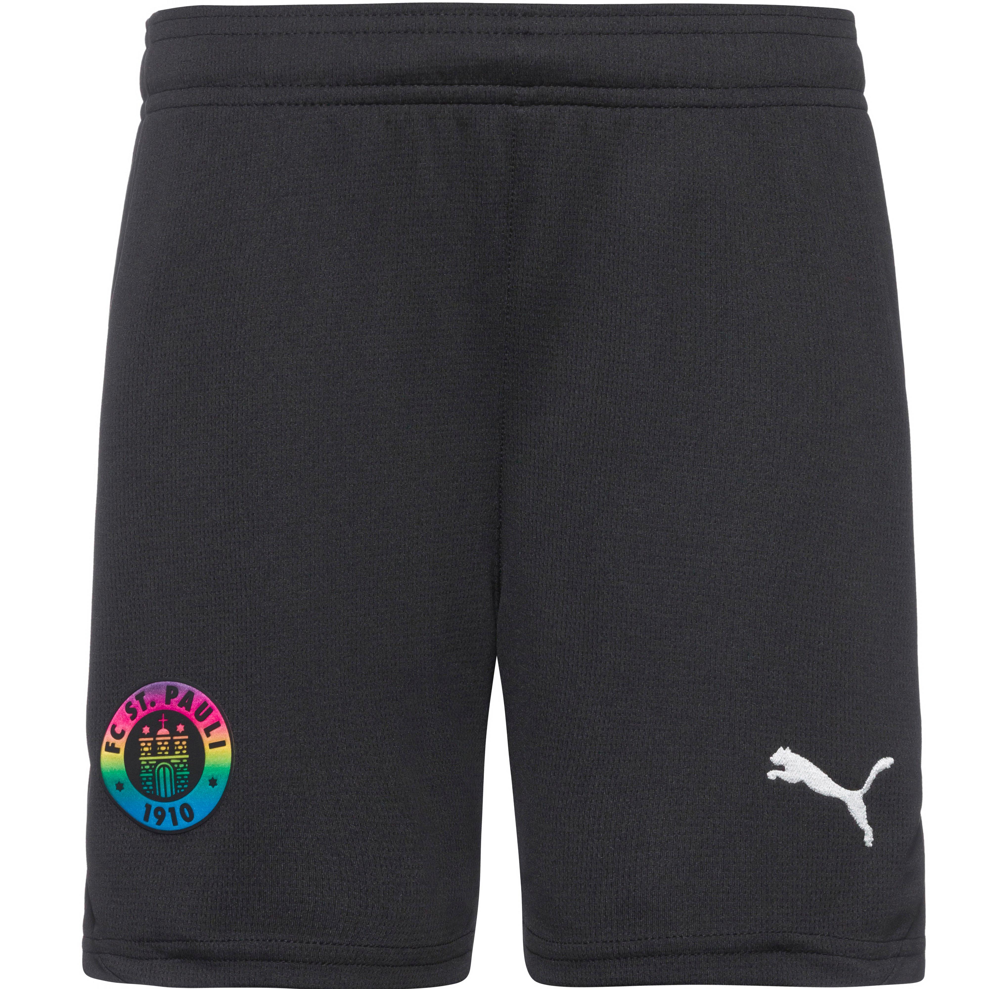 Fußballshorts für Kinder, im Ausweich-Design des FC St. Paulis; mit feuchtigkeitsableitender und schnelltrocknender dryCELL-Technologie; weitenregulierbarer Elastikbund mit innenliegendem Kordelzug; im Re:fibre Prozess aus mind. 95% recyceltem Textilabfall hergestellt; Material 100% Polyester.
