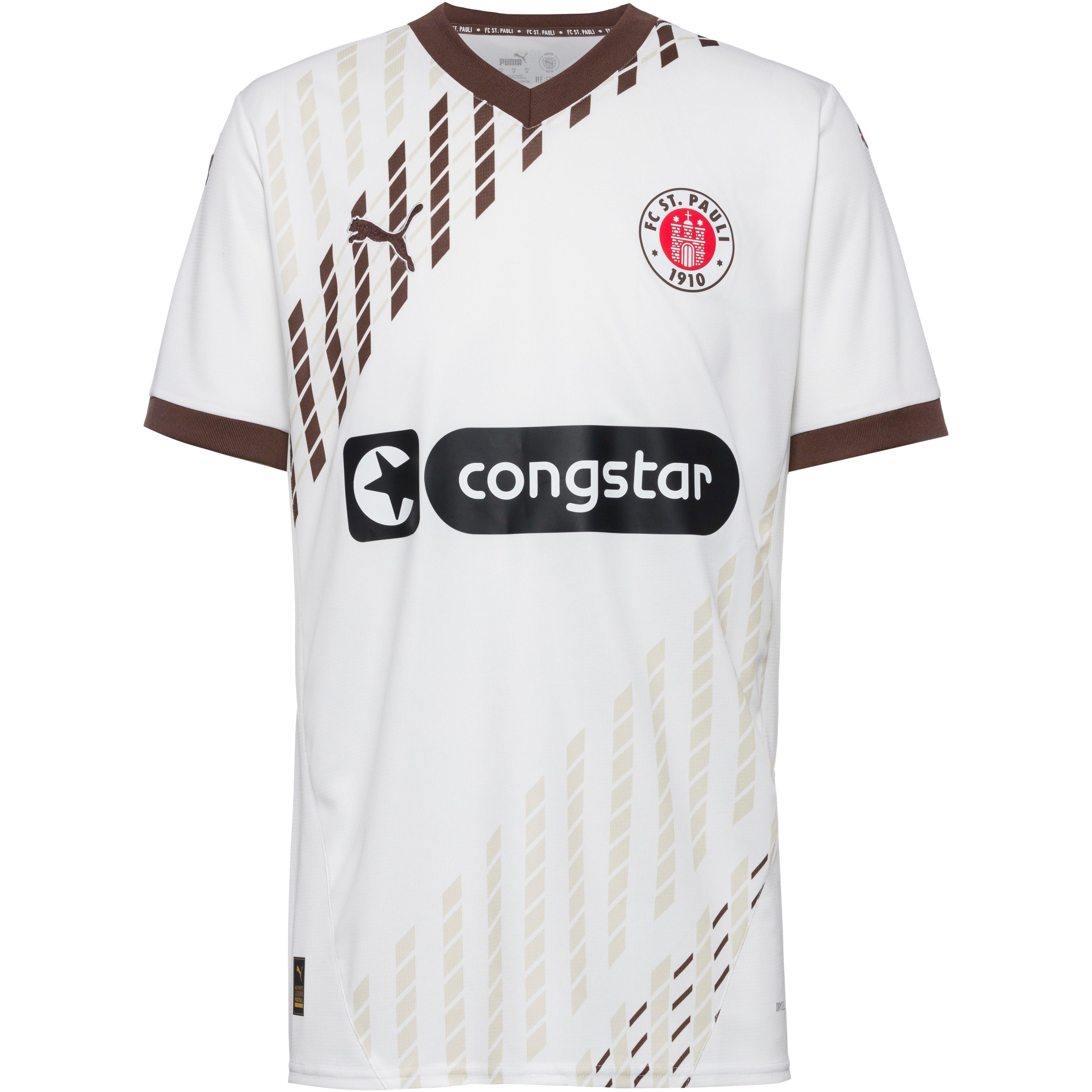 Fußballtrikot im Auswärts-Design des FC St. Paulis; mit feuchtigkeitsableitender und schnelltrocknender dryCELL-Technologie; V-Ausschnitt; Marken-, Sponsoren- und Vereinsdetails auf der Front; im Re:fibre Prozess aus mind. 95% recyceltem Textilabfall hergestellt; Material I 100% Polyester, Material II 97% Polyester, 3% Elastan.