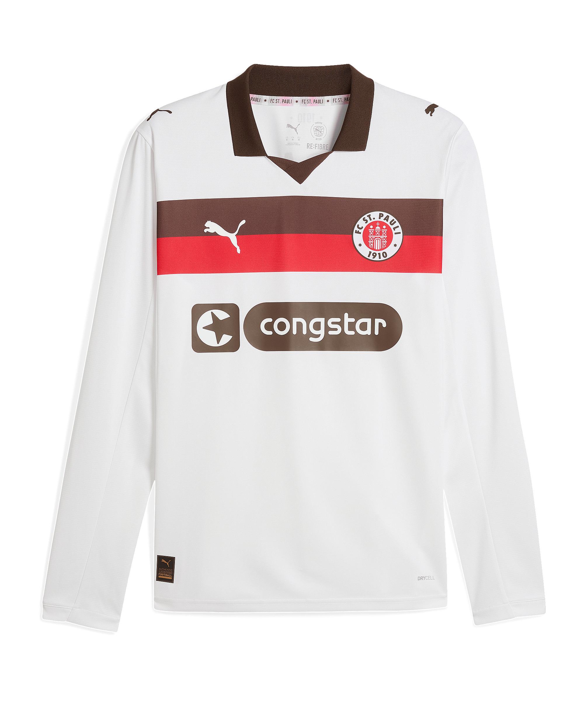 Zieh das PUMA FC St. Pauli Trikot langarm über und zeig, dass du ein echter Kiezkicker-Fan bist. Dieses Trikot ist genau das Richtige für dich, wenn du beim Training oder beim Anfeuern deines Teams in der 1. Bundesliga Flagge zeigen willst. Mit seinem schmalen Schnitt sitzt es wie angegossen und sorgt dafür, dass du dich frei bewegen kannst, egal ob auf dem Platz oder in der Fankurve. Das Vereinswappen auf der Brust zeigt stolz deine Unterstützung für den FC St. Pauli. Die langärmelige Variante hält dich auch an kühleren Tagen angenehm warm. Schnapp dir das Trikot und sei bereit für die nächste Herausforderung. Du wirst die Qualität und den Style von PUMA spüren und lieben. Produktdetails:Herstellerfarbbezeichnung: PUMA White-Espresso BrownHauptfarbe: WeißTechnologie-Eigenschaften: atmungsaktiv, komfortabel, schweißableitendMaterial: 100% Polyester