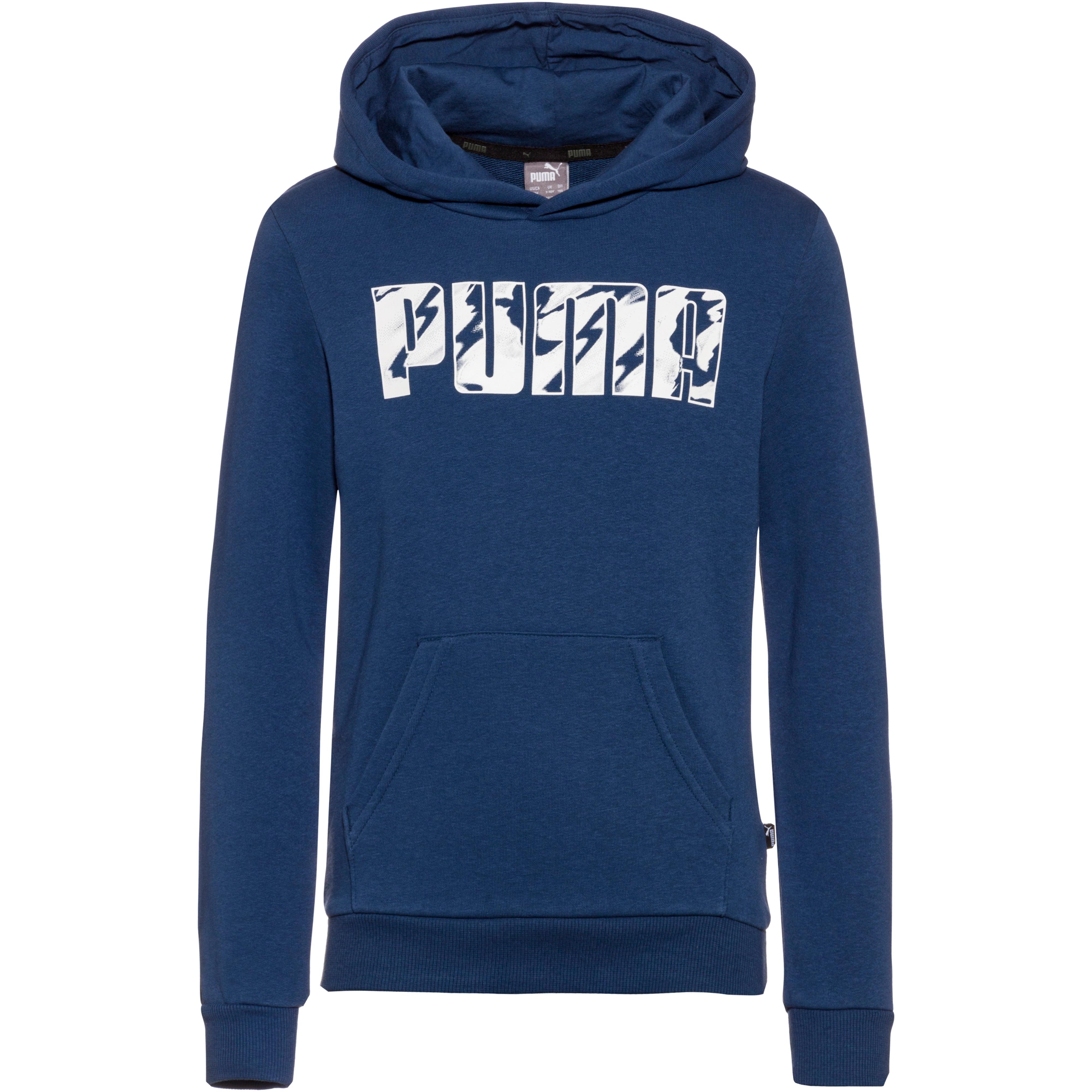 PUMA Lässiger Hoodie für Kinder aus weichem Baumwollmischgewebe mit geräumiger Kapuze; Kängurutasche; Abschlüsse mit Rippbündchen; angeraute Innenseite; Brustprint; Logo-Detail; Material 68% Baumwolle, 32% Polyester.