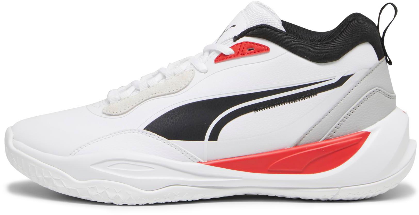 Atmungsaktive Basketballschuhe; Textil-Obermaterial mit synthetischen und ledrigen Elementen; klassische Schnürung; seitliche Formstrips; gepolsterter Kragen mit Zuglasche an der Ferse; dämpfende ProFoam-Zwischensohle; Gummi-Außensohle.