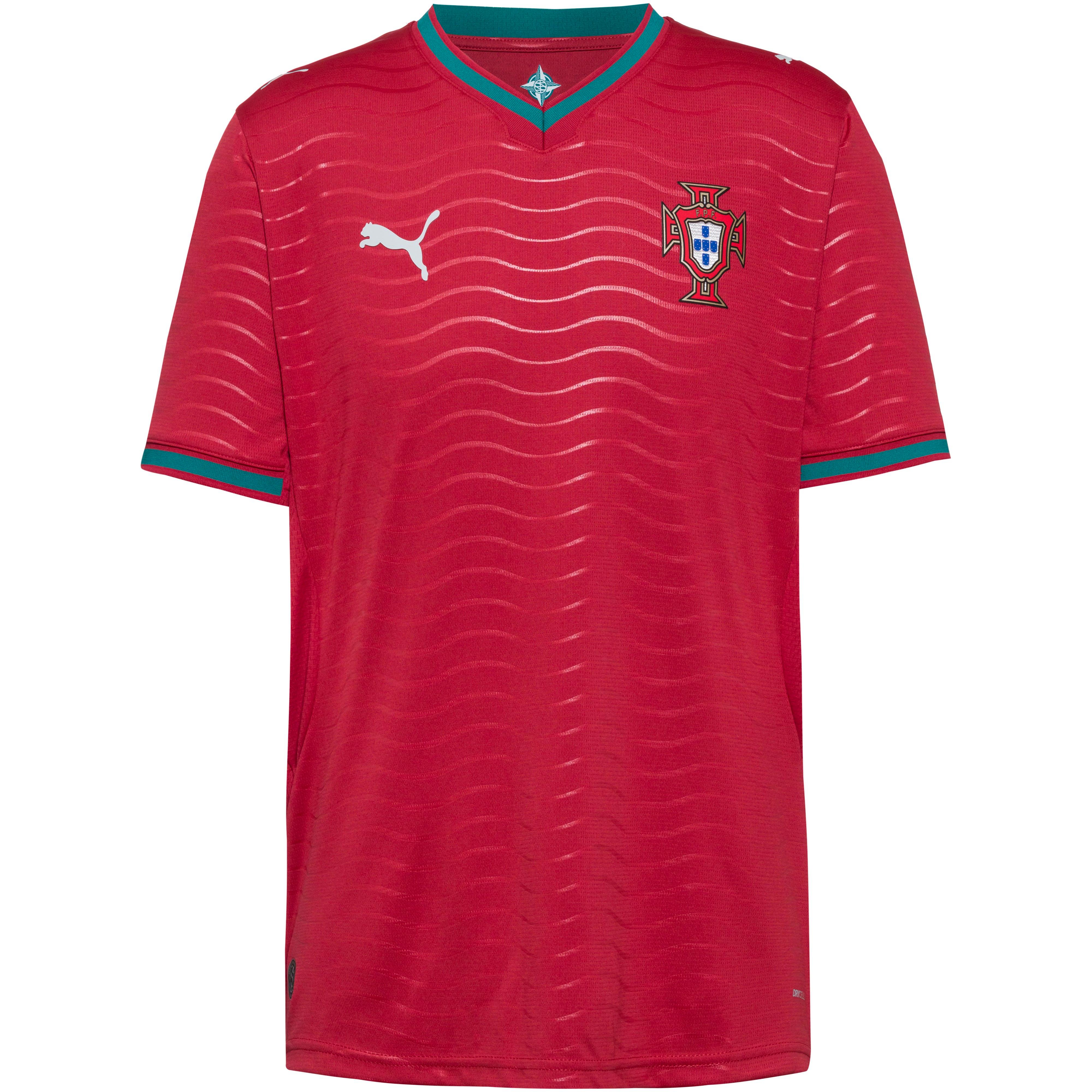 Teamtrikot der portugiesischen Nationalmannschaft, mit feuchtigkeitsableitender und schnelltrocknender dryCELL-Technologie; V-Ausschnitt; Marken- und Vereinsdetails; im Re:fibre Prozess aus mind. 95% recyceltem Textilabfall hergestellt; Material I 100% Polyester; Material II 97% Polyester, 3% Elastan.