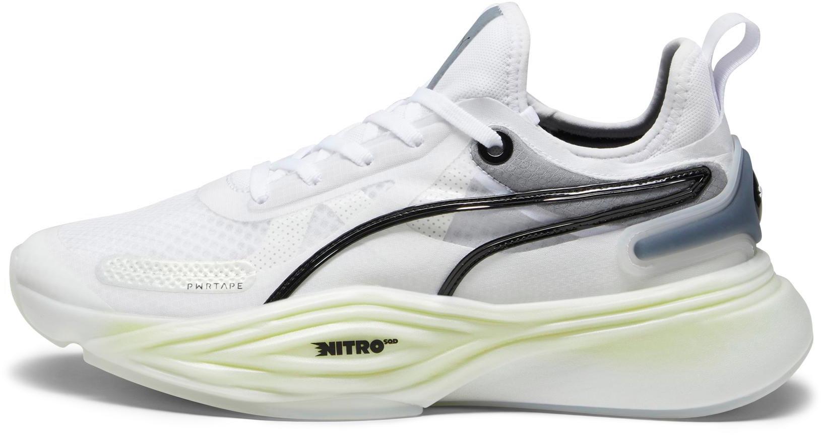 Fitnesschuhe mit seitlichem PUMA-Formstrip; atmungsaktives Mesh-Obermaterial mit PWRTAPE-Verstärkung; Schnürsenkel; Zuglasche an der Ferse; hervorragende Reaktionsfähigkeit und Dämpfung in der Mittelsohle durch NITRO-Technologie; griffige Gummi-Außensohle.