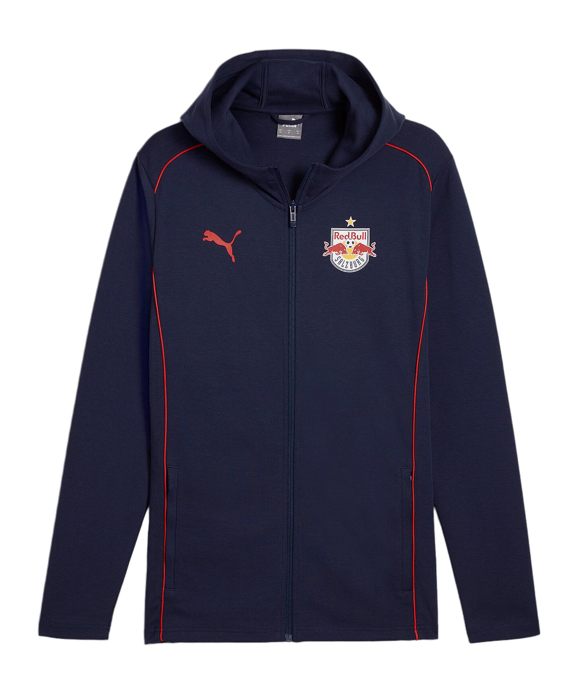 Für echte Fans – das atmungsaktive Modell in Blau begleitet dich ins Stadion, zum Public Viewing oder einfach zum Sportabend mit Freunden. Die Marke PUMA bringt mit der Kapuzenjacke ein erstklassiges Produkt auf den Markt. Zeige deine Zugehörigkeit – mit dieser Red Bull Salzburg-Kapuzenjacke erweiterst du deine Fan-Kollektion um ein Kleidungsstück im Original-Design. Die atmungsaktive, leichte und super bequeme Funktionsweise lässt sie überzeugen. Dies ist eine Kapuzenjacke, die durch das Vereinswappen auf der Brust garantiert trumpfen kann. Verschließe diese Kapuzenjacke ganz bequem und schnell mit dem Reißverschluss. Die vorderen Taschen bieten Platz und Stauraum für alle kleinen Notwendigkeiten. Schlechtes Wetter ist mit der Kapuze ab sofort keine Ausrede mehr. Produktdetails: Extras: Kapuze Ärmellänge: Langärmlig Taschen: vordere Taschen Eigenschaften: super bequem, leicht, atmungsaktiv Material: 63% Baumwolle, 37% Polyester