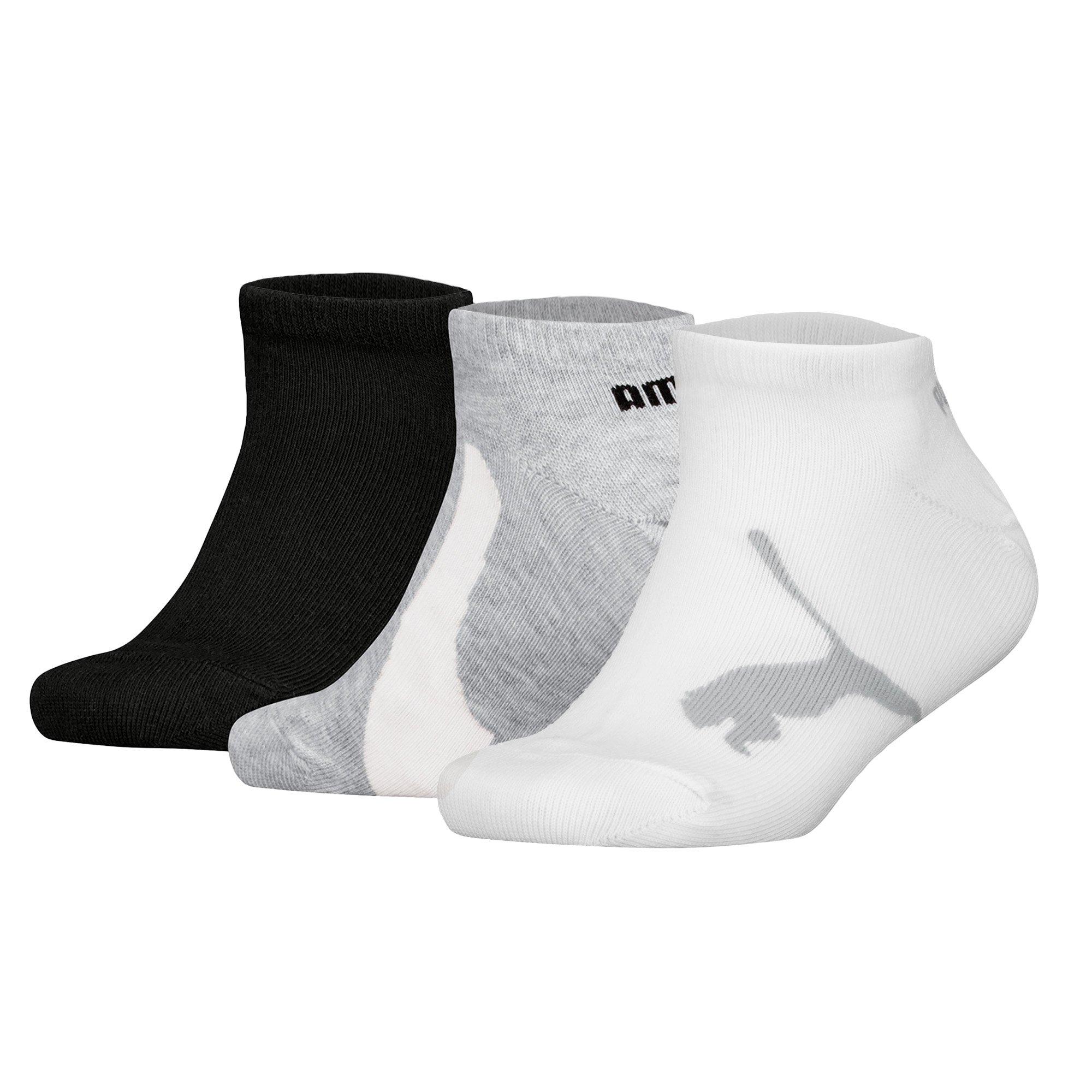 Basic Sneakersocken für Kinder von der Marke PUMA. Einfarbige Socken mit verschiedenen markentypischen Logo im praktischen 3er Pack. Flache Zehennaht.