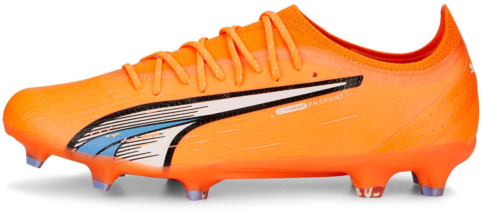 Fußballschuhe mit Stollen für trockenen Naturrasen und Kunstrasen; sockenähnlicher Schaft zum Hineinschlüpfen; leichtes, leistungsstarkes Ultraweave-Obermaterial mit mind. 20% Recyclinganteil; PWRPRINT auf der Oberseite und PWRTAPE im Fersenbereich für Stabilität auf Mikroebene; Schnürsenkel für eine individuelle, enganliegende Passform; PUMA Formstrip an der Seite; Textilfutter; leichte, herausnehmbare Einlegesohle mit NanoGrip-Technologie verhindert das Rutschen im Schuh; 2-fach gepolsterte Speedplate-Außensohle mit Stollen für optimale Traktion.