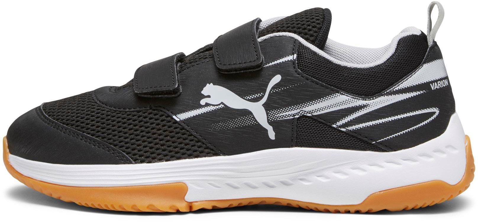 Hallenschuhe aus luftigem Mesh-Obermaterial mit ledrigen Overlays; Verschluss mit zwei Klettriegeln; Anziehlasche an der Ferse; Textilfutter; dämpfende Zwischensohle; profilierte, non-marking Gummi-Außensohle.