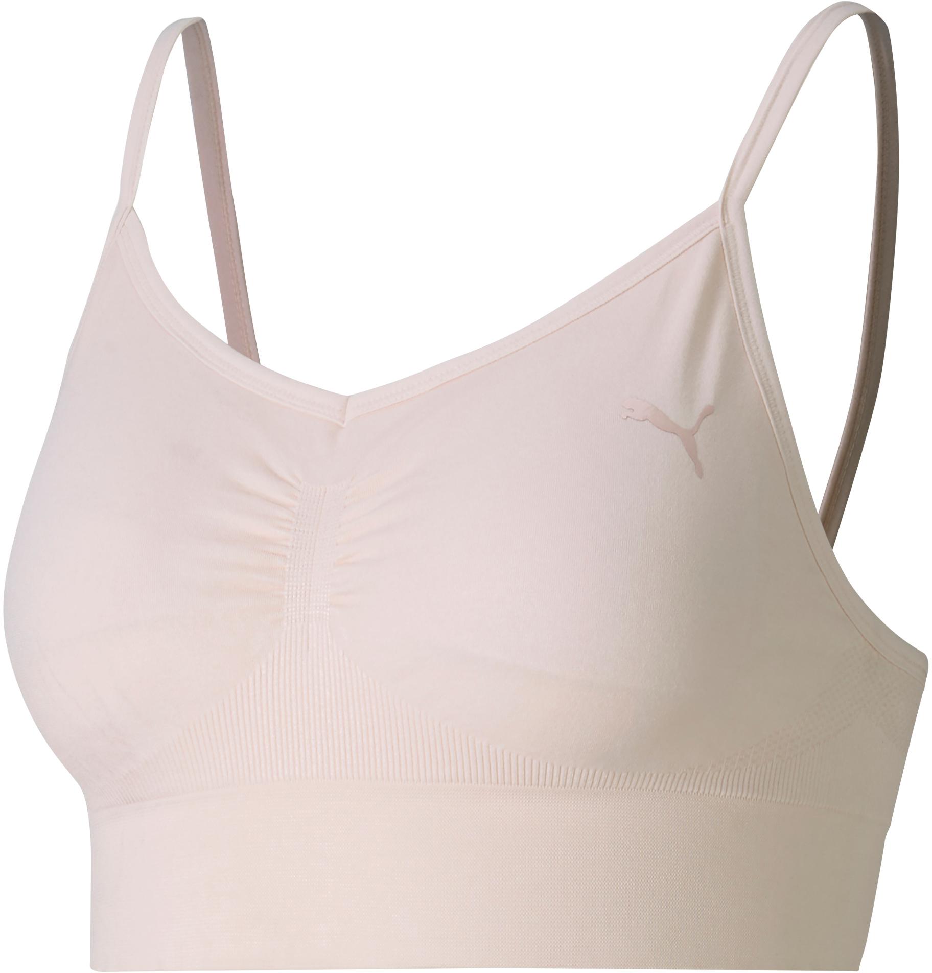 PUMA YOGA. Nahezu nahtlos hergestellter Sport-BH für leichten Halt; feuchtigkeitsregulierende Funktion; V-Ausschnitt; Material I 50% Polyamid, 42% Polyester, 8% Elastan, Material II 97% Polyester, 3% Elastan.