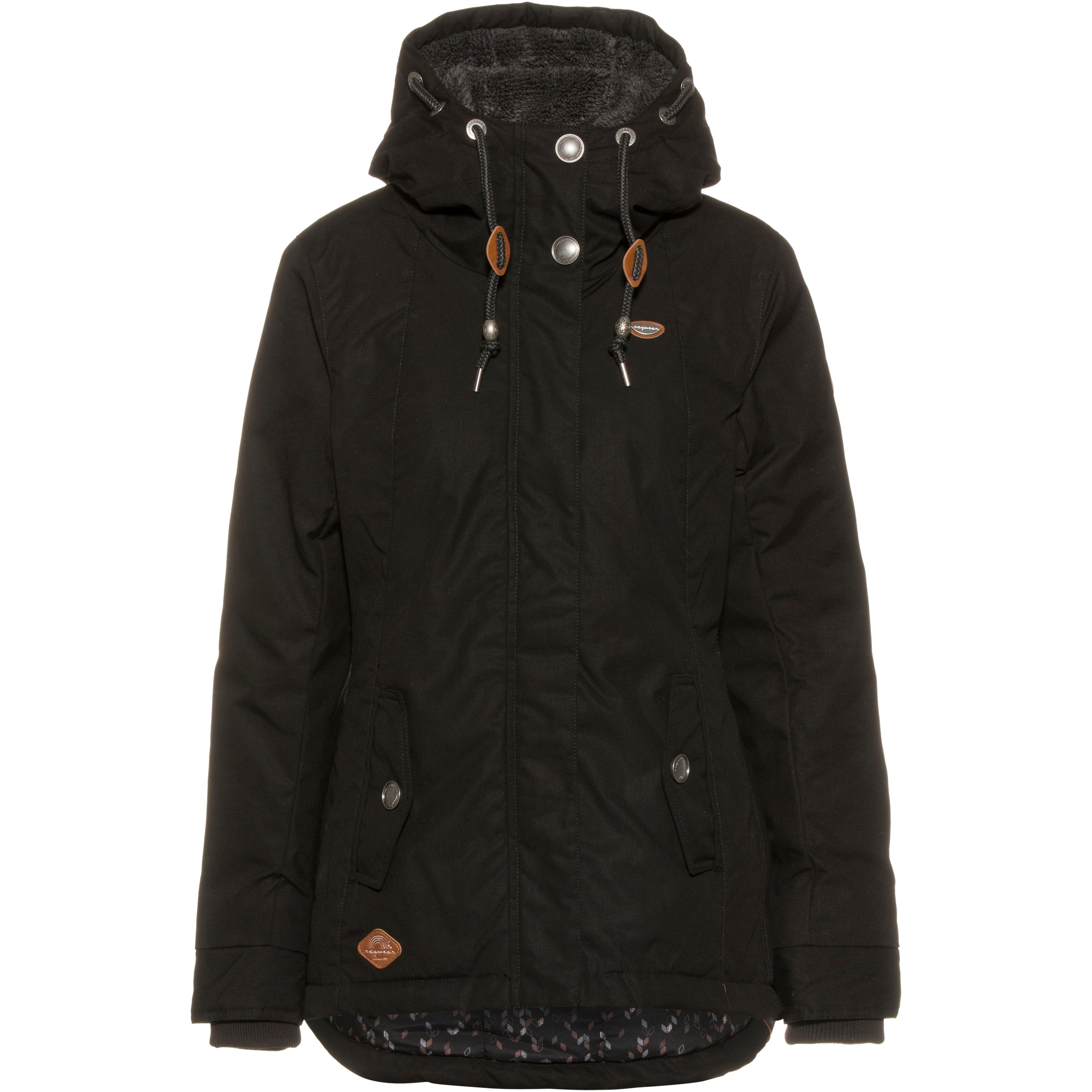 Wattierte Kapuzenjacke mit unterlegtem Frontreißverschluss und Windschutzblende; Kapuze mit Kunstfellfutter und Kordelzug; 2 Seitentaschen mit Druckknopfverschluss; 1 Innentasche mit Reißverschluss; diverse Labeldetails; aus veganen Materialien hergestellt; Material I 65% Polyester, 35% Baumwolle, Material II 100% Polyester.
