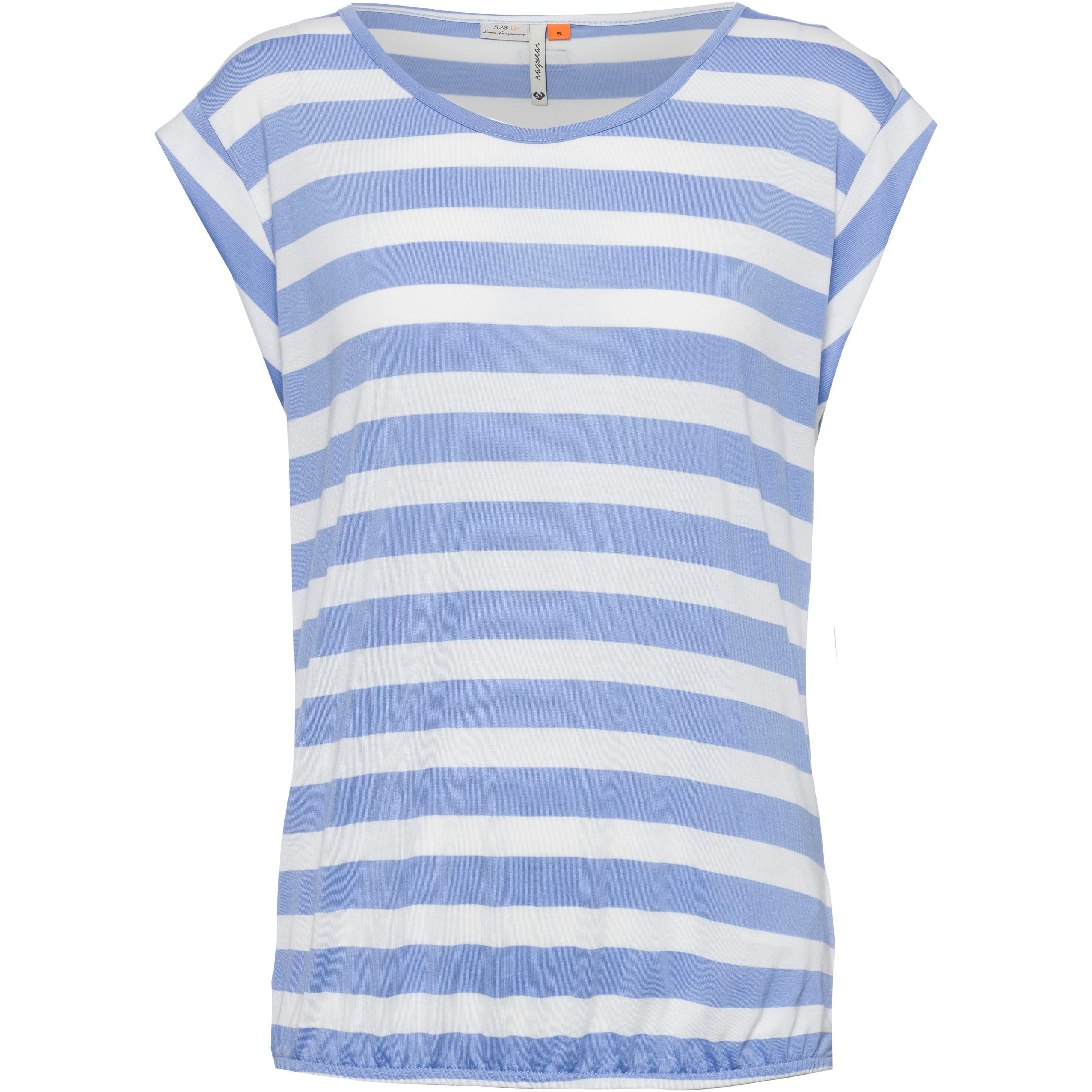 Gestreiftes T-Shirt mit Rundhalsausschnitt; überschnittene Schulterpartie, kurze, angeschnittene Ärmel; elastischer Saum; Material 50% Viskose, 50% Polyester.