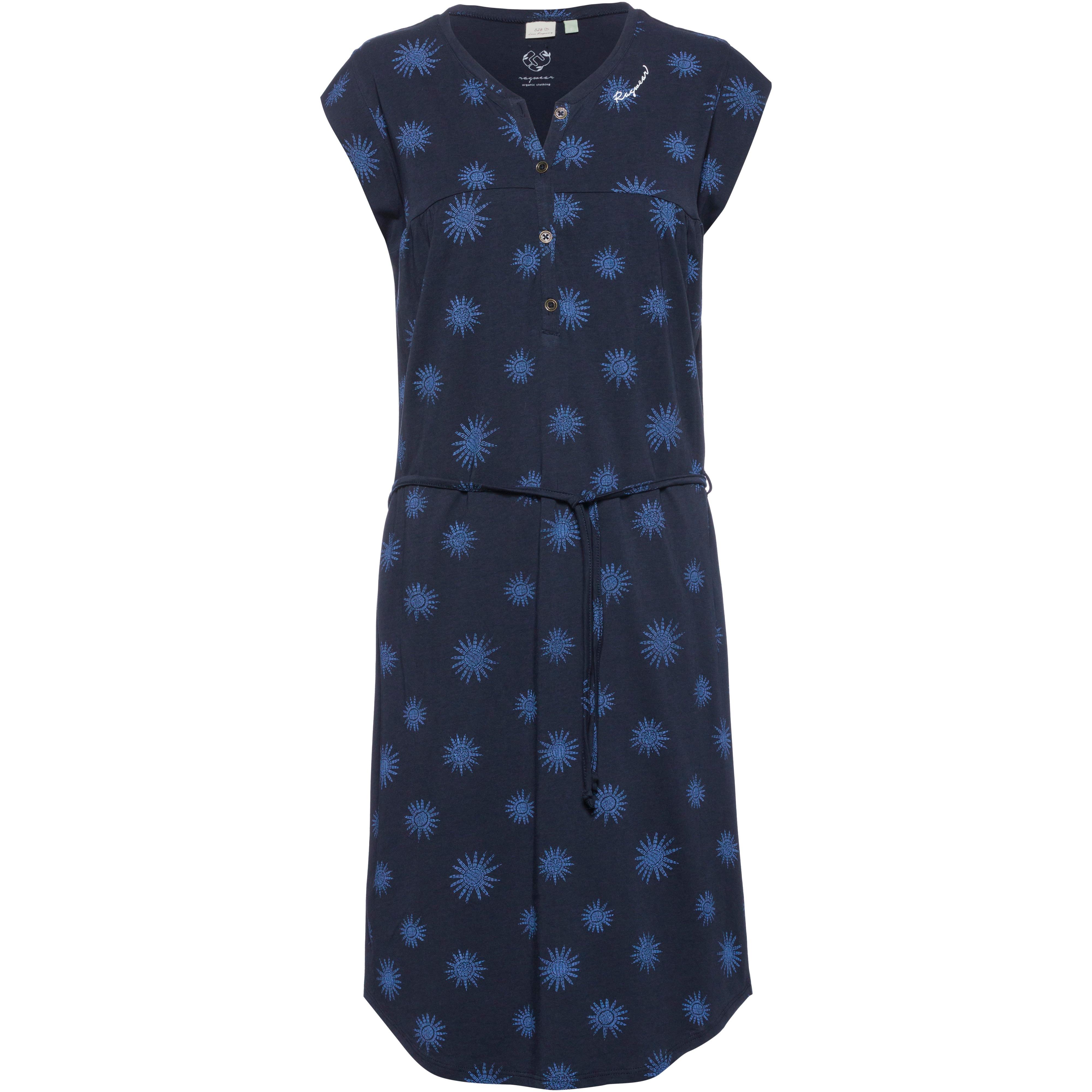 Weiches Jerseykleid mit Allover-Print; überschnittene Schultern mit kurzen Flügelärmeln; V-Ausschnitt mit Knopfleiste auf der Vorderseite; dezente Raffungsdetails über der Brust; Bindeband in der Taille unterstreicht die feminine Silhouette; abgerundeter Saum; Seitenlänge: ca. 100 cm/Gr. S; vegan; GOTS-zertifiziert; Material 50% Lyocell, 50% Baumwolle (Biobaumwolle).