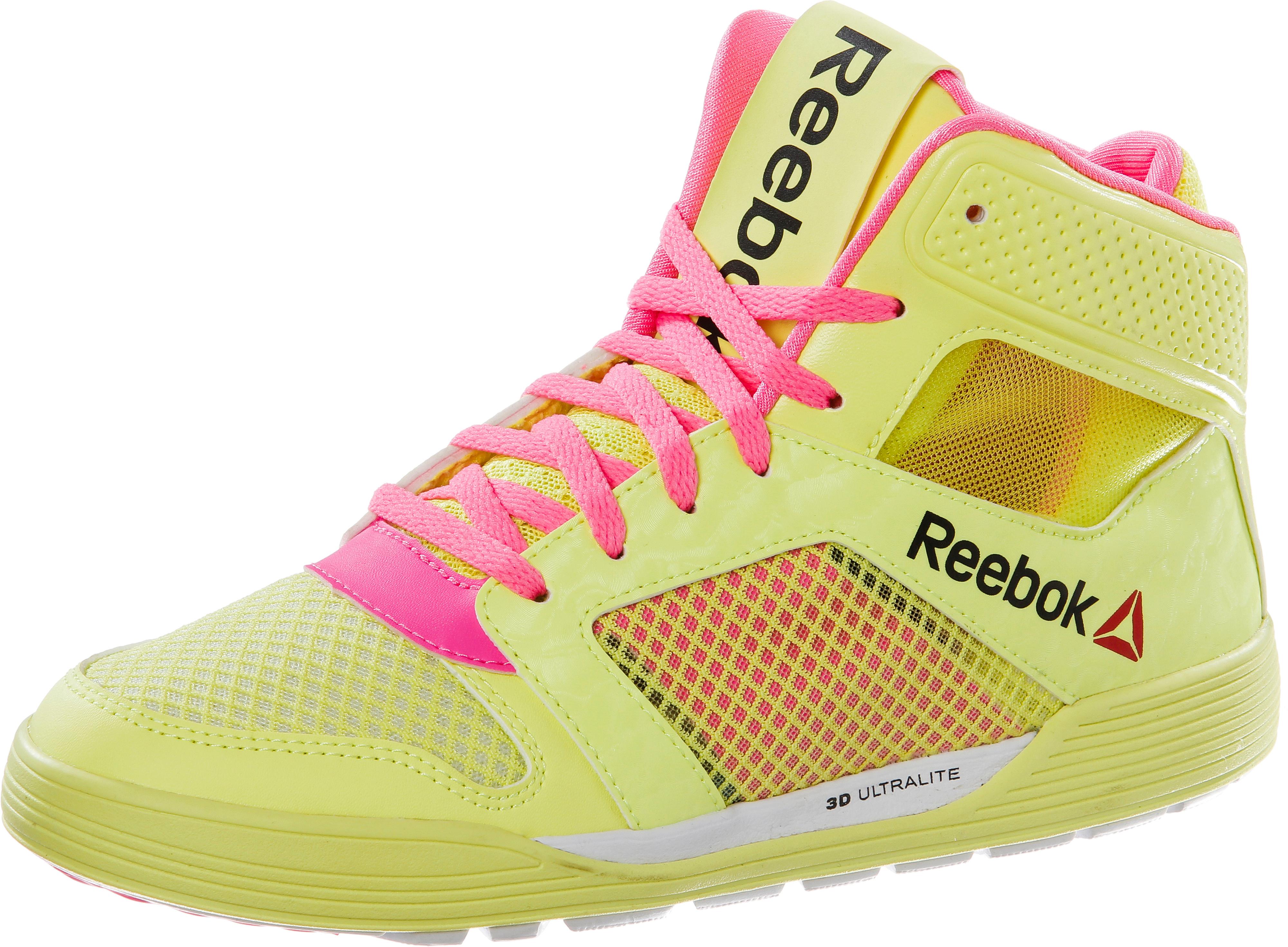 Reebok DANCE URTEMPO MID. Knöchelhoher Fitnessschuh aus transparentem Mesh mit Synthetikbesätzen, perfekt als Tanzschuh geeignet. Durch den Drehpunkt und die asymmetrische Mittellinie passt sich der Schuh optimal den Tanzbewegungen an. Der halbhohe Schnitt, das Obermaterial aus Synthetik und Mesh, die 3D Ultralite-Technologie und eine geformte und abriebfeste Außensohle sorgen für Langlebigkeit, Tragekomfort und seitlichen Halt. Optimale Bewegungsfreiheit und Flexibilität sind garantiert.