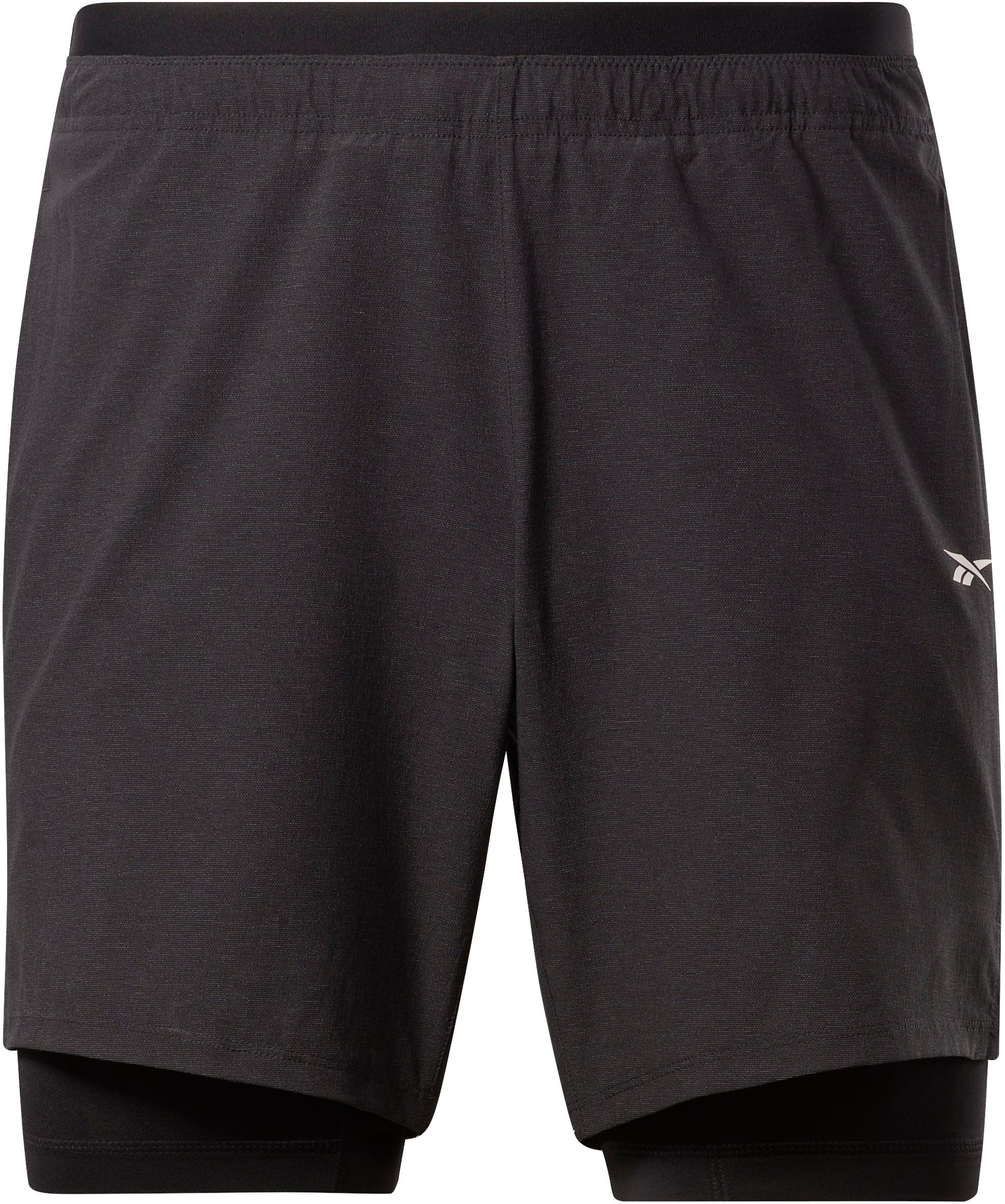 2in1-Funktionsshorts aus elastischem, leicht meliertem Material; mit feuchtigkeitsregulierender SpeedWick-Technologie; komfortabler Elastikbund mit integriertem Kordelzug; seitliche Eingrifftaschen; Logodetail; Seitenschlitze; integrierte Tights mit Kompressionsfunktion; normale Passform; mit Recyclingmaterial hergestellt; Material 87% Polyester (recycelt), 13% Elastan.