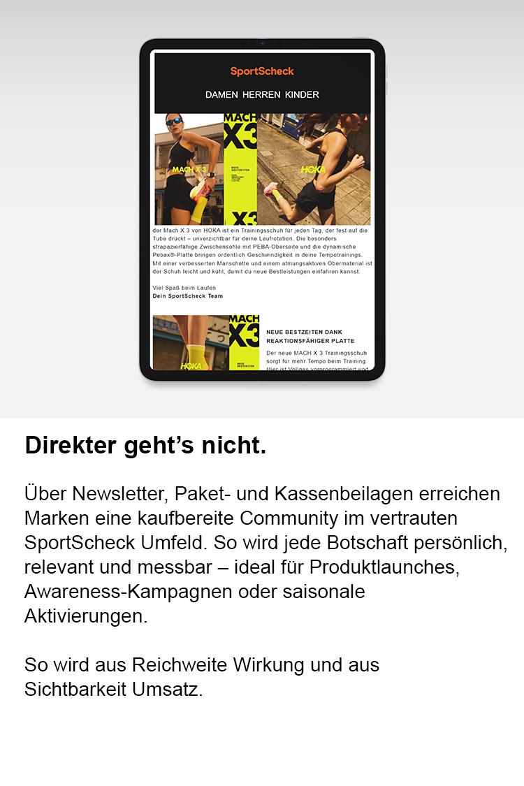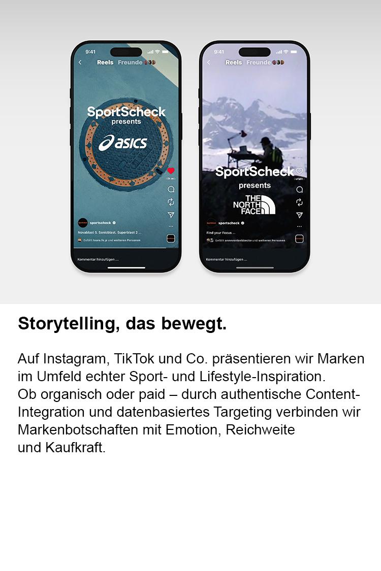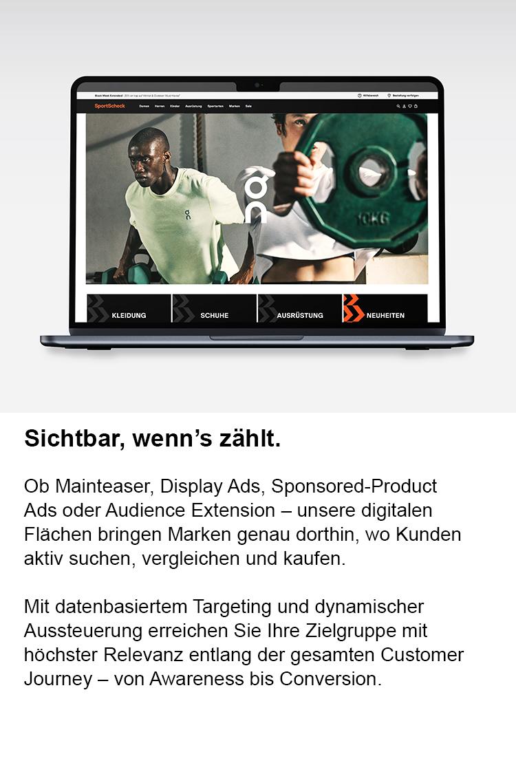 Mit SportScheck Retail Media bringen Marken ihre Botschaft genau dorthin, wo Sportbegeisterte kaufen, erleben und sich inspirieren lassen: online, im Store und in unserer aktiven Community.