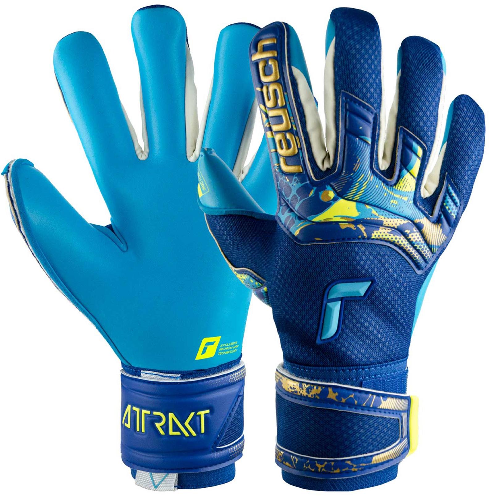 Der Reusch Attrakt Aqua bietet mit dem Aqua Grip dank einzigartiger Latexzusammensetzung und exklusiver Hydrograin-Partikel hervorragenden Grip bei trockenen und vor allem nassen Spielbedingungen. Dadurch eignet er sich perfekt für Einsätze bei Regen und bietet auch unter diesen Umständen eine hervorragende Griffigkeit. Die Latex Gussets sorgen für noch mehr Grip und eine perfekte Ballkontrolle. Der in Deutschland hergestellte Reusch Grip Latex bildet die Grundlage für insgesamt 11 weitere einzigartige Latexmischungen. Alle Schaumstoffe wurden mit einzigartigen Zusammensetzungen, Zusatzstoffen und Veredelungen entwickelt, welche die Leistung des Produkts und des Keepers steigern. Der Latex Belag auf der Oberhand bietet die nötige Stabilität und Kontrolle beim Fausten. Beim Evolution Negative Cut rollt sich der Belag um die Fingerspitzen und generiert dabei eine enge Passform und größtmögliche Kontaktfläche zwischen Latex und Ball für beste Ballkontrolle. Eine Innennahtkonstruktion im unteren Fingerbereich sorgt für eine sehr enge, flexible und anatomische Form. Die vollständig umlaufende Bandage ist unser bewährtes Befestigungssystem für maximale Stabilität und super Tragekomfort. Der anatomisch vorgeformte Schnitt des Handschuhs und die leichte Vorspreizung der Finger unterstützen die natürliche Fanghaltung der Hände. Die gerollte Konstruktion zwischen Daumen und Zeigefinger verhindert störende Nähte und verbessert die Passform und den Tragekomfort. Der Belag dehnt sich über die Innenseite des Daumens nahezu bis auf den Handrücken aus. Die Fangfläche wird so deutlich vergrößert und der Daumen bekommt eine funktionale 3D-Passform. Der Handschuh garantiert unübertroffenen Grip und eine hohe Abriebfestigkeit für alle Wetterbedingungen und Spieloberflächen. Aufgrund der ideal aufeinander abgestimmten Materialzusammensetzung ist der Handschuh sehr atmungsaktiv. Der bewährte Verschluss aus äußerst dehnbarem Textil garantiert eine optimale Passform und zusätzliche Stabilität am Handgelenk.