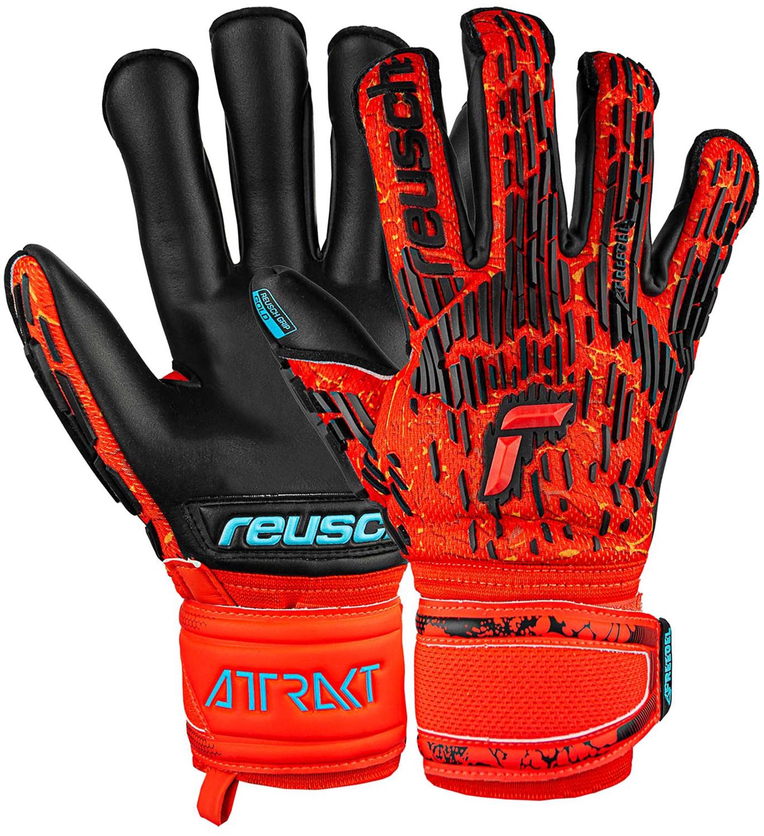 Dank dem Reusch Grip Gold Latex garantiert der Reusch Attrakt Freegel Gold zuverlässige Haltbarkeit. Dieser Profi-Haftschaum garantiert dank Zugabe des größtmöglichen Anteils an hochwertigem Naturlatex hervorragende Griffigkeit. Die Latex Gussets sorgen für noch mehr Grip und eine perfekte Ballkontrolle. Beim Evolution Negative Cut rollt sich der Belag um die Fingerspitzen und generiert dabei eine enge Passform und größtmögliche Kontaktfläche zwischen Latex und Ball für beste Ballkontrolle. Eine Innennahtkonstruktion im unteren Fingerbereich sorgt für eine sehr enge, flexible und anatomische Form. Die extrem leichte und widerstandsfähige Faustzone aus silikonartigem Obermaterial sorgt für eine robuste und gleichzeitig sehr flexible Rückhand. Die vollständig umlaufende Bandage ist unser bewährtes Befestigungssystem für maximale Stabilität und super Tragekomfort. Der anatomisch vorgeformte Schnitt des Handschuhs und die leichte Vorspreizung der Finger unterstützen die natürliche Fanghaltung der Hände. Die zusätzliche Latexschicht sorgt für verbesserte Abriebfestigkeit und Haltbarkeit an der stärksten beanspruchten Stelle des Belags. Das AirVentSystem sorgt für maximale Ventilation im Handschuh und ein hoch atmungsaktives Mesh-Material ermöglicht eine optimale Luftzirkulation. Die gerollte Konstruktion zwischen Daumen und Zeigefinger verhindert störende Nähte und verbessert die Passform und den Tragekomfort. Der Belag dehnt sich über die Innenseite des Daumens nahezu bis auf den Handrücken aus. Die Fangfläche wird so deutlich vergrößert und der Daumen bekommt eine funktionale 3D-Passform. Der bewährte Verschluss aus äußerst dehnbarem Textil garantiert eine optimale Passform und zusätzliche Stabilität am Handgelenk. Der Handschuh ist perfekt für den aktiven Spielbetrieb eines ambitionierten Torhüters geeignet.