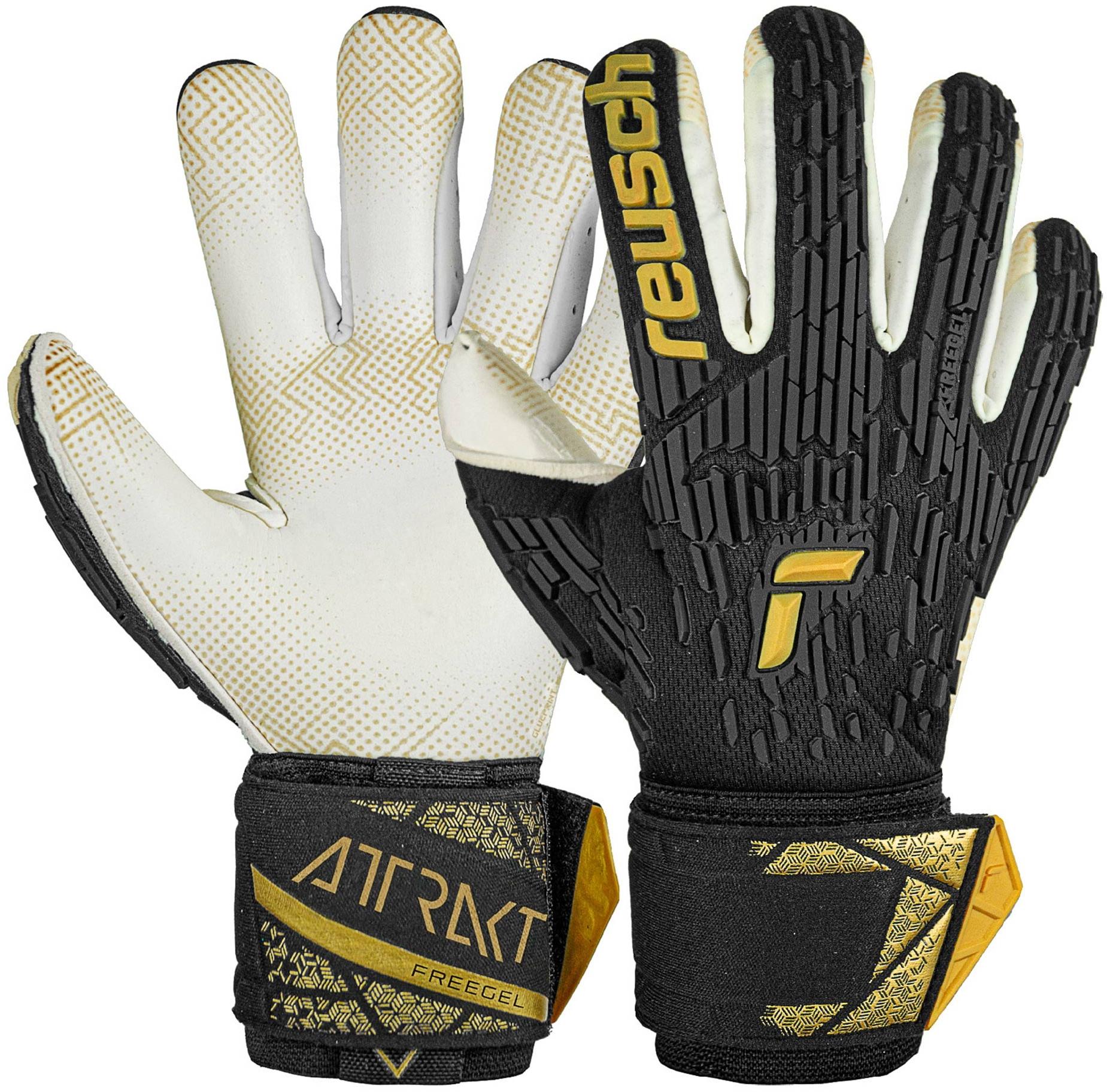 Tauche ein in die Welt des Torwartspiels mit dem Reusch Attrakt Freegel Gold X! Maximale Griffigkeit und Klebrigkeit sind garantiert durch den Evolution Negative Cut, der sich um die Fingerspitzen rollt und eine enge Passform für beste Ballkontrolle bietet. Das innovative Fingerschutzsystem mit fünf Protektionsstäben reduziert das Verletzungsrisiko und bewahrt gleichzeitig Flexibilität. Die silikonartige Faustzone gewährleistet Robustheit und Flexibilität. Ein spezieller Klebedruck verstärkt den Griff, strategisch platzierte Belüftungskanäle sorgen für kühle Hände. Der anatomisch vorgeformte Schnitt und die gerollte Konstruktion zwischen Daumen und Zeigefinger verbessern Passform und Tragekomfort. Erlebe ultimative Performance mit dem Attrakt Freegel Gold X - Deinem zuverlässigen Partner auf dem Spielfeld!